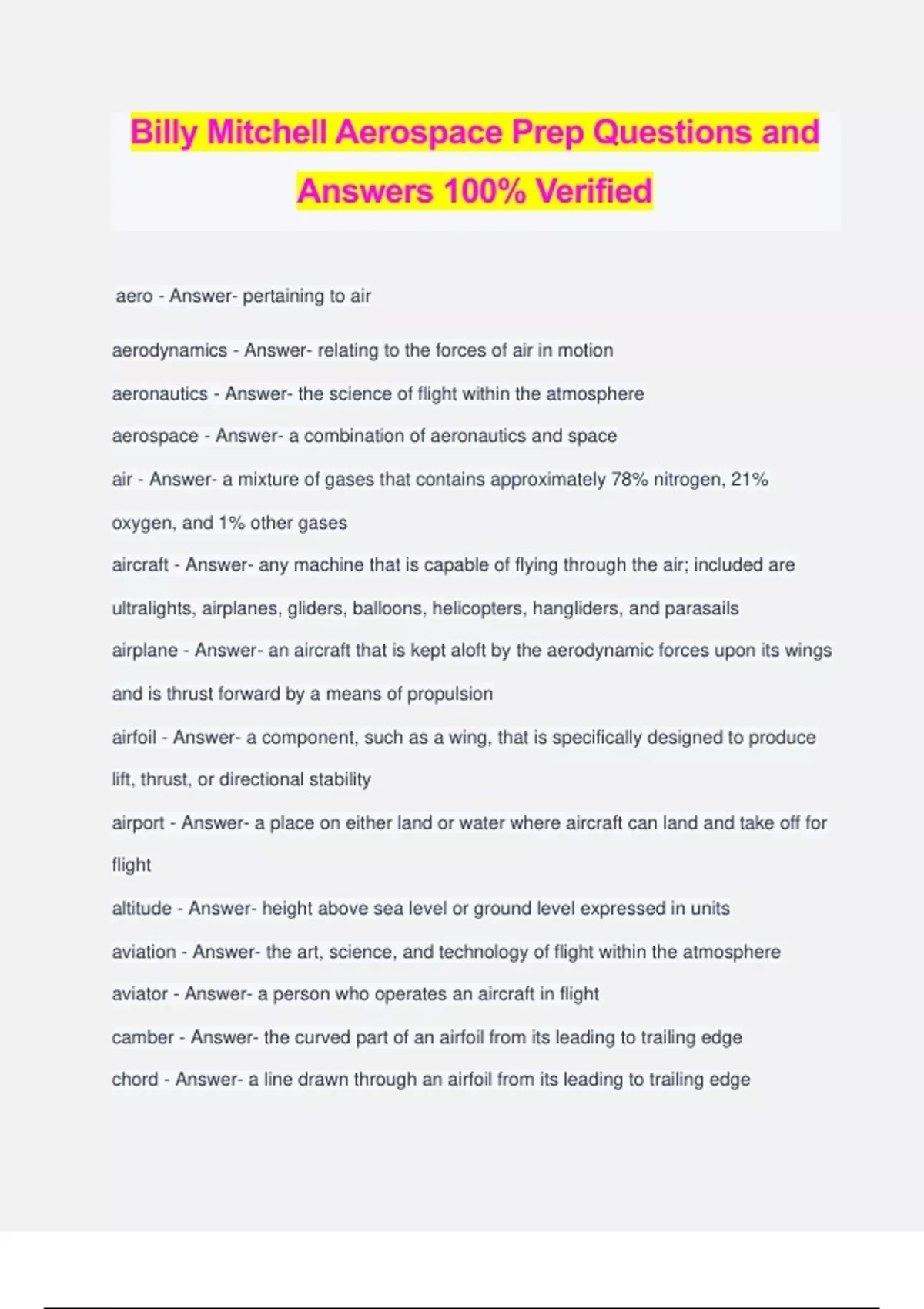 Billy Mitchell Aerospace Prep Questions and Answers 100% Verified aero - Answer- pertaining to air aerodynamics - Answer- relating to the forces of air in motion aeronautics - Answer- the science of flight within the atmosphere aerospace - Answer- a combination of aeronautics and space air - Answer- a mixture of gases that contains approximately 78% nitrogen, 21% oxygen, and 1% other gases aircraft - Answer- any machine that is capable of flying through the air; included are ultralights, airplanes, gliders, balloons, helicopters, hangliders, and parasails airplane - Answer- an aircraft that is kept aloft by the aerodynamic forces upon its wings and is thrust forward by a means of propulsion airfoil - Answer- a component, such as a wing, that is specifically designed to produce lift, thrust, or directional stability airport - Answer- a place on either land or water where aircraft can land and take off for flight altitude - Answer- height above sea level or ground level expressed in units aviation - Answer- the art, science, and technology of flight within the atmosphere aviator - Answer- a person who operates an aircraft in flight camber - Answer- the curved part of an airfoil from its leading to trailing edge chord - Answer- a line drawn through an airfoil from its leading to trailing edge downwash - Answer- the downward movement of air behind a wing in flight drag - Answer- a force which slows the forward movement of an aircraft in flight dynamic - Answer- forces in motion gravity - Answer- the natural force pulling everything to Earth leading edge - Answer- the front part of a wing or airfoil lift - Answer- the upward force that opposes gravity and supports the weight of an aircraft relative wind - Answer- the flow of air which moves opposite the flight path of an airplane thrust - Answer- the force which moves an aircraft forward in flight upwash - Answer- the upward movement of air ahead of the wing in flight vortex - Answer- a spinning column of air that is created behind the wingtip as a result of air moving from an area of high pressure on the bottom to an area of low pressure wind - Answer- Air in motion 1299 AD / Marco Polo - Answer- Who saw Chinese sailor