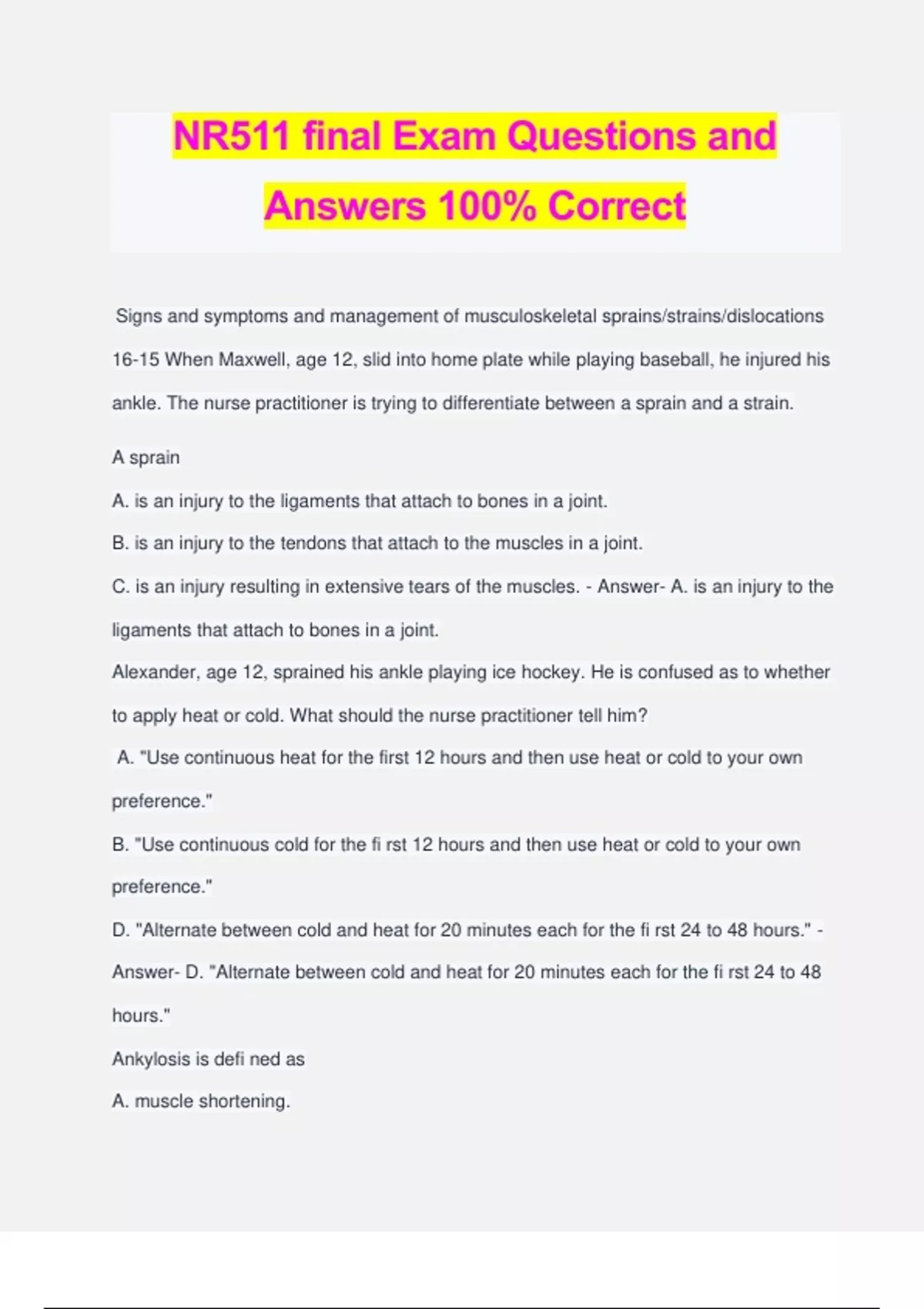 NR511 final Exam Questions and Answers 100% Correct Signs and symptoms and management of musculoskeletal sprains/strains/dislocations 16-15 When Maxwell, age 12, slid into home plate while playing baseball, he injured his ankle. The nurse practitioner is trying to differentiate between a sprain and a strain. A sprain A. is an injury to the ligaments that attach to bones in a joint. B. is an injury to the tendons that attach to the muscles in a joint. C. is an injury resulting in extensive tears of the muscles. - Answer- A. is an injury to the ligaments that attach to bones in a joint. Alexander, age 12, sprained his ankle playing ice hockey. He is confused as to whether to apply heat or cold. What should the nurse practitioner tell him? A. "Use continuous heat for the first 12 hours and then use heat or cold to your own preference." B. "Use continuous cold for the fi rst 12 hours and then use heat or cold to your own preference." D. "Alternate between cold and heat for 20 minutes each for the fi rst 24 to 48 hours." - Answer- D. "Alternate between cold and heat for 20 minutes each for the fi rst 24 to 48 hours." Ankylosis is defi ned as A. muscle shortening. B. joint stiffness. C. malposition of a joint. D. dislocation of a joint. - Answer- B. joint stiffness. Jill, age 49, has recently begun a rigorous weight- lifting regimen. She presents to the primary care office with a shoulder dislocation. Which of the following clinical manifestations lead the nurse practitioner to suspect an anterior shoulder dislocation over a posterior dislocation? A. Inability to shrug the shoulder B. Absence of pain C. Inability to rotate the shoulder externally D. Shortening of the arm - Answer- A. Inability to shrug the shoulder In assessing an infant for developmental dysplasia of the hip (DDH), the practitioner places the infant supine, fl exes the knees by holding the thumbs on the inner mid- thighs, with fi ngers outside on the hips touching the greater trochanters, stabilizes one hip, and abducts and gently pulls anteriorly on the other thigh. If this external rotation feels smooth with no sound present, there is no hip dislocation. This is A. the Allis test. B. Lasè gue's sign. C. the McMurray test. D. the Ortolani maneuver - Answer- D. the Ortolani maneuver Emily, age 12, presents to the clinic with another muscle strain from one of her many sports activities. The nurse practitioner thinks that the patient was probably never taught about health promotion and maintenance regarding physical activity. What information should be included in patient teaching? A. "After an activity, if any part hurts, apply ice for 20 minutes." B. "You must fi rst get in shape with a rigorous schedule of weight training, and then you can participate in any activity once you are physically fi