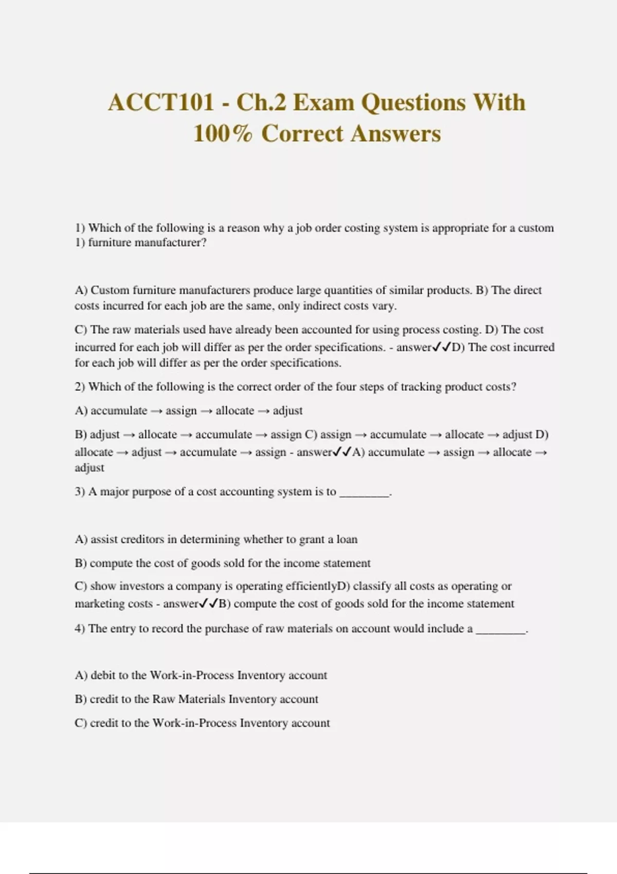 ACCT101 - Ch.2 Exam Questions With 100% Correct Answers 1) Which of the following is a reason why a job order costing system is appropriate for a custom 1) furniture manufacturer? A) Custom furniture manufacturers produce large quantities of similar products. B) The direct costs incurred for each job are the same, only indirect costs vary. C) The raw materials used have already been accounted for using process costing. D) The cost incurred for each job will differ as per the order specifications. - answerD) The cost incurred for each job will differ as per the order specifications. 2) Which of the following is the correct order of the four steps of tracking product costs? A) accumulate → assign → allocate → adjust B) adjust → allocate → accumulate → assign C) assign → accumulate → allocate → adjust D) allocate → adjust → accumulate → assign - answerA) accumulate → assign → allocate → adjust 3) A major purpose of a cost accounting system is to ________. A) assist creditors in determining whether to grant a loan B) compute the cost of goods sold for the income statement C) show investors a company is operating efficientlyD) classify all costs as operating or marketing costs - answerB) compute the cost of goods sold for the income statement 4) The entry to record the purchase of raw materials on account would include a ________. A) debit to the Work-in-Process Inventory account B) credit to the Raw Materials Inventory account C) credit to the Work-in-Process Inventory account D) debit to the Raw Materials Inventory account - answerD) debit to the Raw Materials Inventory account 5) Which of the following accounts would be debited in the journal entry to record the issuance of direct materials? A) Work-in-Process Inventory B) Finished Goods Inventory C) Cost of Goods Sold D) Raw Materials Inventory - answerA) Work-in-Process Inventory 7) The journal entry to issue $800 of direct materials and $60 of indirect materials to production involves debit(s) to the ________. A) Work-in-Process Inventory account for $800 and Manufacturing Overhead account for $60 B) Work-in-Process Inventory account for $860 C) Manufacturing Overhead account for $860 D) Work-in-Process Inventory account for $800 and Finished Goods Inventory account for $60 - answerA) Work-in-Process Inventory account for $800 and Manufacturing Overhead account for $60 6) The journal entry to issue indirect materials to production should include a debit to the ________. A) Work-in-Process Inventory account B) Finished Goods Inventory accountC) Raw Materials Inventory account D) Manufacturing Overhead account - answerD) Manufacturing Overhead account Adelphia Manufacturing issued $80,000 of direct materials and $8000 of indirect materials for 8) production. Which of the following journal entries would correctly record the transaction? Manufacturing Overhead 88,000 Raw Materials Inventory 88,000 Work-in-Process Inventory 88,000 Raw Materials Inventory