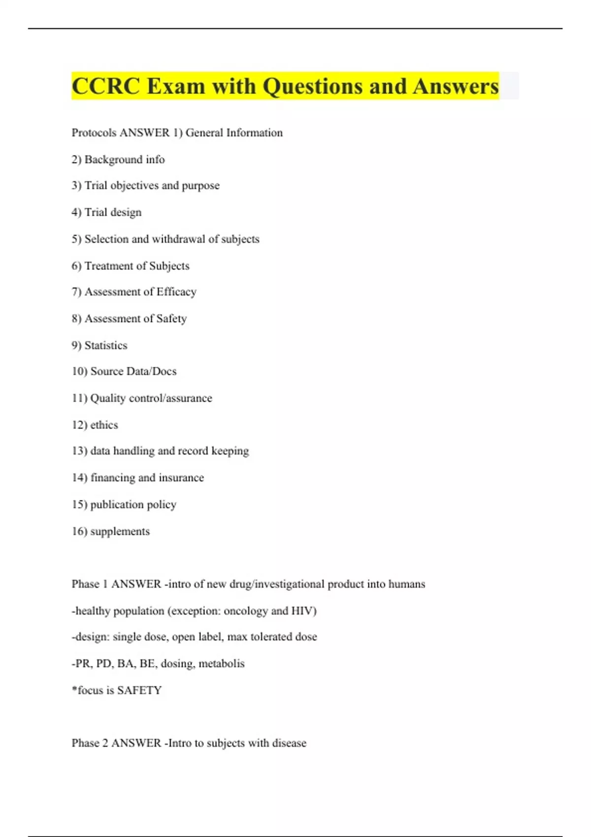 CCRC Exam with Questions and Answers Protocols ANSWER 1) General Information 2) Background info 3) Trial objectives and purpose 4) Trial design 5) Selection and withdrawal of subjects 6) Treatment of Subjects 7) Assessment of Efficacy 8) Assessment of Safety 9) Statistics 10) Source Data/Docs 11) Quality control/assurance 12) ethics 13) data handling and record keeping 14) financing and insurance 15) publication policy 16) supplements Phase 1 ANSWER -intro of new drug/investigational product into humans -healthy population (exception: oncology and HIV) -design: single dose, open label, max tolerated dose -PR, PD, BA, BE, dosing, metabolis *focus is SAFETY Phase 2 ANSWER -Intro to subjects with disease -design: compare with placebo (exception: cancer and antibiotics), double blind