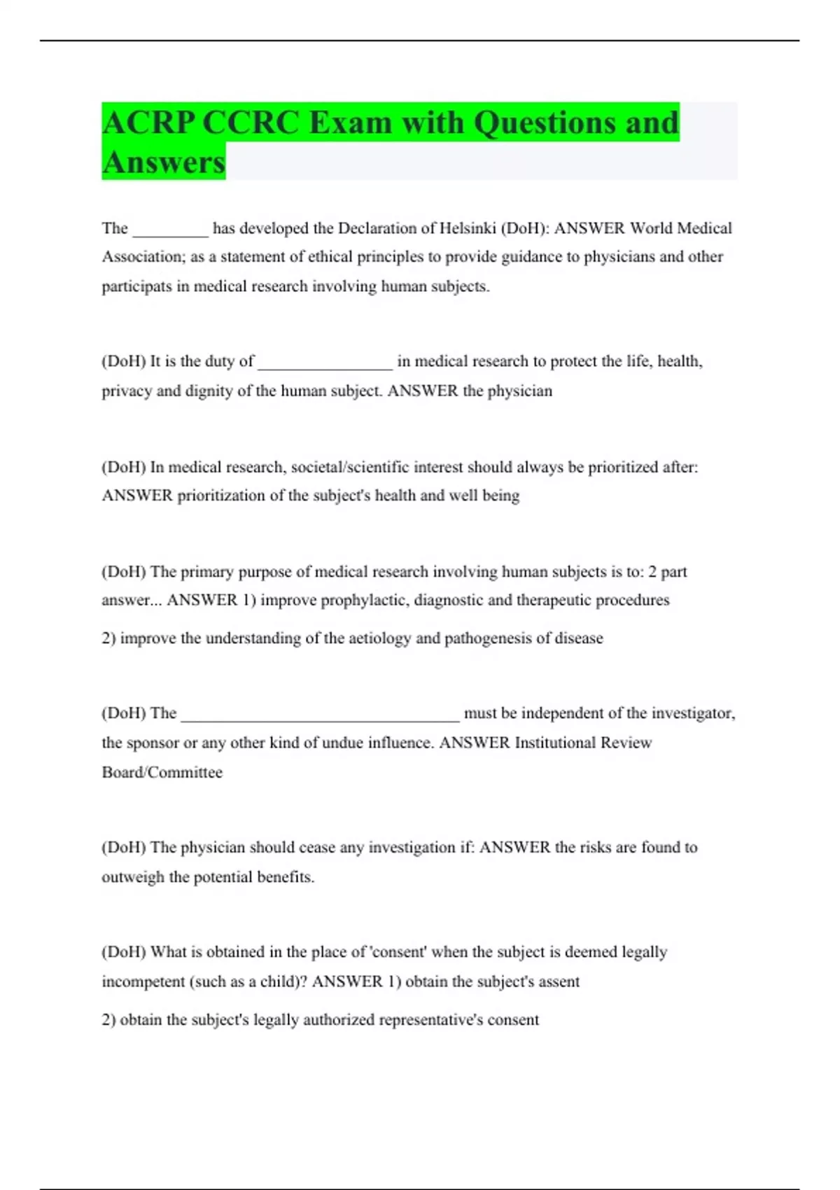 ACRP CCRC Exam with Questions and Answers The _________ has developed the Declaration of Helsinki (DoH): ANSWER World Medical Association; as a statement of ethical principles to provide guidance to physicians and other participats in medical research involving human subjects. (DoH) It is the duty of ________________ in medical research to protect the life, health, privacy and dignity of the human subject. ANSWER the physician (DoH) In medical research, societal/scientific interest should always be prioritized after: ANSWER prioritization of the subject's health and well being (DoH) The primary purpose of medical research involving human subjects is to: 2 part answer... ANSWER 1) improve prophylactic, diagnostic and therapeutic procedures 2) improve the understanding of the aetiology and pathogenesis of disease (DoH) The _________________________________ must be independent of the investigator, the sponsor or any other kind of undue influence. ANSWER Institutional Review Board/Committee (DoH) The physician should cease any investigation if: ANSWER the risks are found to outweigh the potential benefits. (DoH) What is obtained in the place of 'consent' when the subject is deemed legally incompetent (such as a child)? ANSWER 1) obtain the subject's assent 2) obtain the subject's legally authorized representative's consent