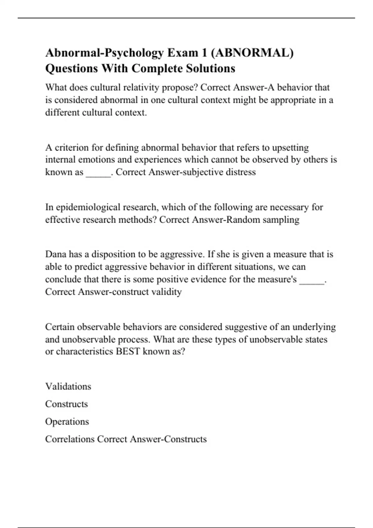 What does cultural relativity propose? Correct Answer-A behavior that is considered abnormal in one cultural context might be appropriate in a different cultural context. A criterion for defining abnormal behavior that refers to upsetting internal emotions and experiences which cannot be observed by others is known as _____. Correct Answer-subjective distress In epidemiological research, which of the following are necessary for effective research methods? Correct Answer-Random sampling Dana has a disposition to be aggressive. If she is given a measure that is able to predict aggressive behavior in different situations, we can conclude that there is some positive evidence for the measure's _____. Correct Answer-construct validity Certain observable behaviors are considered suggestive of an underlying and unobservable process. What are these types of unobservable states or characteristics BEST known as? Validations
