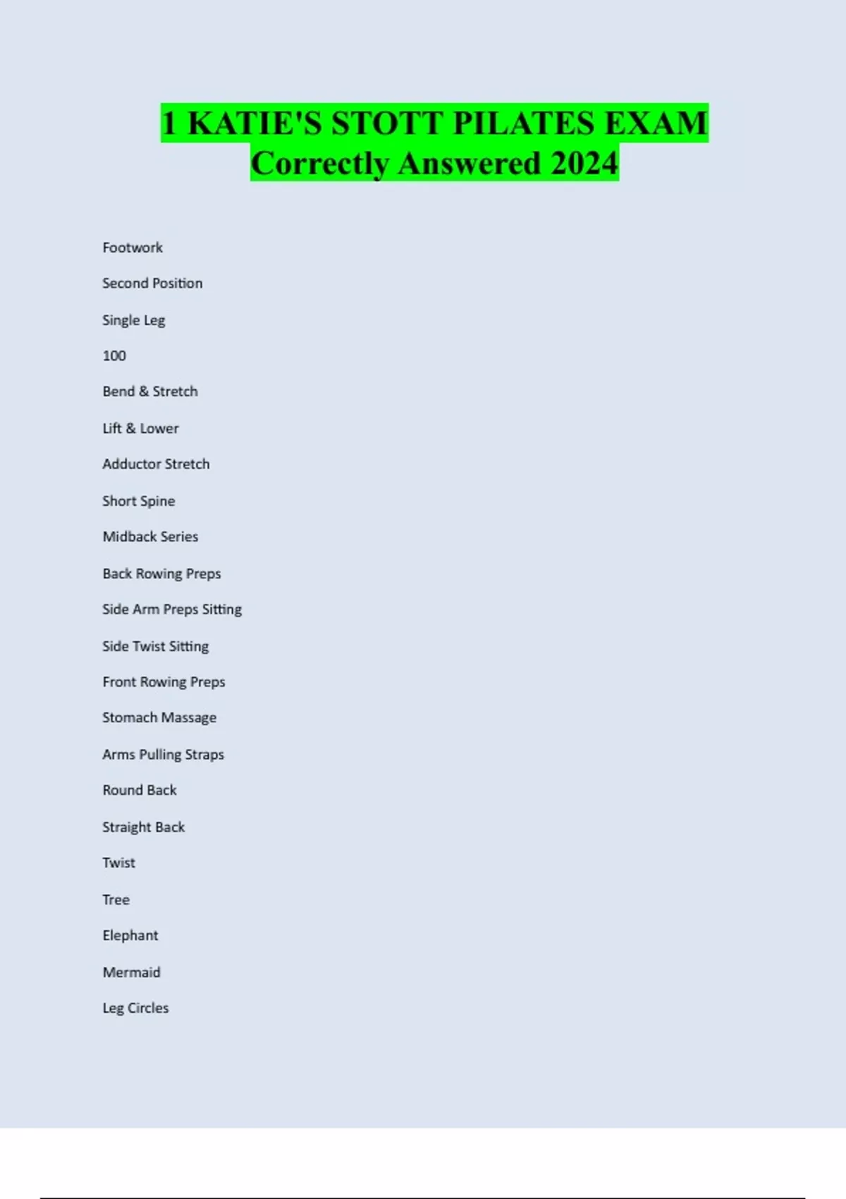 1 KATIE'S STOTT PILATES EXAM Correctly Answered 2024 Footwork Second Position Single Leg 100 Bend & Stretch Lift & Lower Adductor Stretch Short Spine Midback Series Back Rowing Preps Side Arm Preps Sitting Side Twist Sitting Front Rowing Preps Stomach Massage Arms Pulling Straps Round Back Straight Back Twist Tree Elephant Mermaid Leg