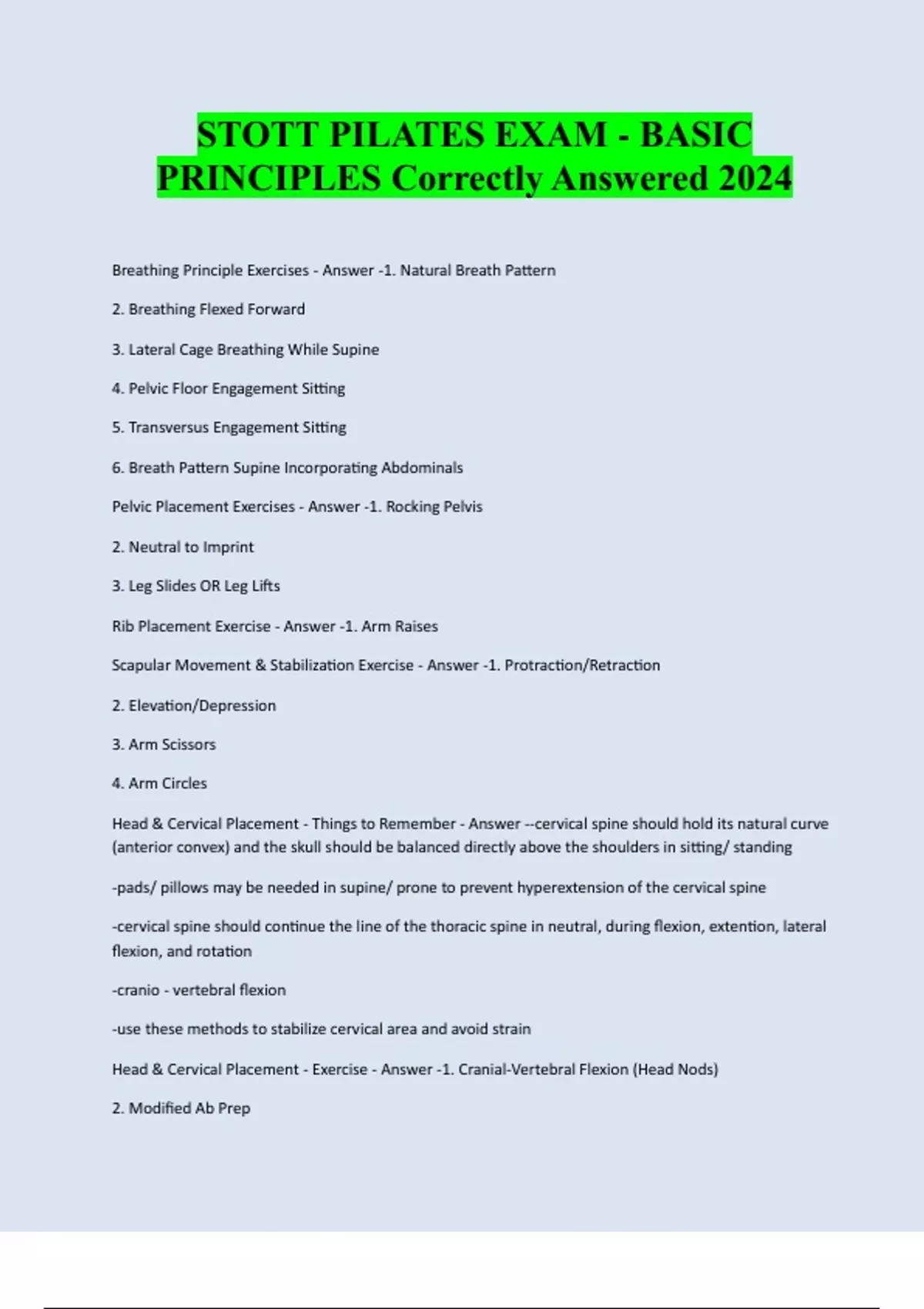STOTT PILATES EXAM - BASIC PRINCIPLES Correctly Answered 2024 Breathing Principle Exercises - Answer -1. Natural Breath Pattern 2. Breathing Flexed Forward 3. Lateral Cage Breathing While Supine 4. Pelvic Floor Engagement Sitting 5. Transversus Engagement Sitting 6. Breath Pattern Supine Incorporating Abdominals Pelvic Placement Exercises - Answer -1. Rocking Pelvis 2. Neutral to Imprint 3. Leg Slides OR Leg Lifts Rib Placement Exercise - Answer -1. Arm Raises