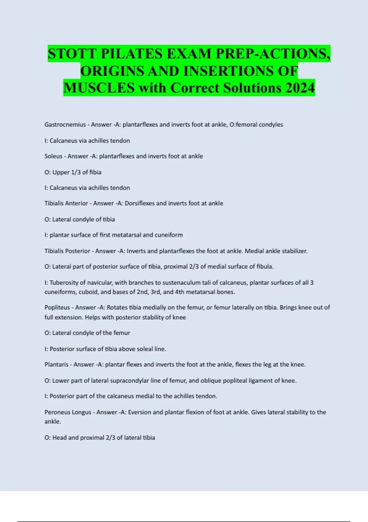 STOTT PILATES EXAM PREP-ACTIONS, ORIGINS AND INSERTIONS OF MUSCLES with Correct Solutions 2024 Gastrocnemius - Answer -A: plantarflexes and inverts foot at ankle, O:femoral condyles I: Calcaneus via achilles tendon Soleus - Answer -A: plantarflexes and inverts foot at ankle O: Upper 1/3 of fibia I: Calcaneus via achilles tendon Tibialis Anterior - Answer -A: Dorsiflexes and inverts foot at ankle O: Lateral condyle of tibia I: plantar surface of first metatarsal and cuneiform Tibialis Posterior - Answer -A: Inverts and plantarflexes the foot at ankle. Medial ankle stabilizer. O: Lateral part of posterior surface of tibia, proximal 2/3 of medial surface of fibula. I: Tuberosity of navicular, with branches to sustenaculum tali of calcaneus, plantar surfaces of all 3 cuneiforms, cuboid, and bases of 2nd, 3rd, and 4th metatarsal bones. Popliteus - Answer -A: Rotates tibia medially on the femur, or femur laterally on tibia. Brings knee out of full extension. Helps with posterior stability of knee O: Lateral condyle of the femur I: Posterior surface of tibia above soleal line. Plantaris - Answer -A: plantar flexes and inverts the foot at the ankle, flexes the leg at the knee. O: Lower part of lateral supracondylar line of femur, and oblique popliteal ligament of knee. I: Posterior part of the calcaneus medial to the achilles tendon. Peroneus Longus - Answer -A: Eversion and plantar flexion of foot at ankle. Gives lateral stability to the ankle. O: Head and proximal 2/3 of lateral tibiaI: Lateral margin of plantar surface of 1st cuneiform and metatarsal. Peroneus Brevis - Answer -A: Eversion and plantar flexion of the foot at the ankle. Gives lateral stability to the ankle. O: Distal 2/3 of the lateral fibula. I: Tuberosity on lateral side of 5th metatarsal