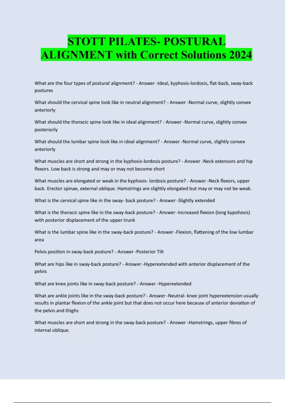 STOTT PILATES- POSTURAL ALIGNMENT with Correct Solutions 2024 What are the four types of postural alignment? - Answer -Ideal, kyphosis-lordosis, flat-back, sway-back postures What should the cervical spine look like in neutral alignment? - Answer -Normal curve, slightly convex anteriorly What should the thoracic spine look like in ideal alignment? - Answer -Normal curve, slightly convex posteriorly What should the lumbar spine look like in ideal alignment? - Answer -Normal curve, slightly convex anteriorly What muscles are short and strong in the kyphosis-lordosis posture? - Answer -Neck extensors and hip flexors. Low back is strong and may or may not become short What muscles are elongated or weak in the kyphosis- lordosis posture? - Answer -Neck flexors, upper back. Erector spinae, external oblique. Hamstrings are slightly elongated but m