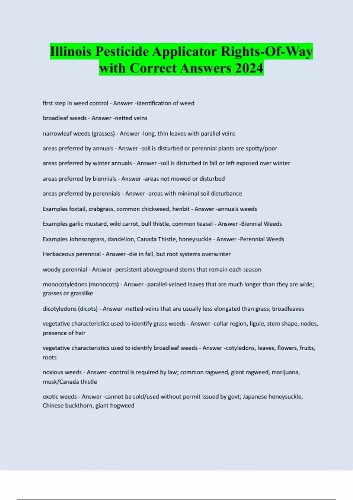 Illinois Pesticide Applicator Rights-Of-Way with Correct Answers 2024 first step in weed control - Answer -identification of weed broadleaf weeds - Answer -netted veins narrowleaf weeds (grasses) - Answer -long, thin leaves with parallel veins areas preferred by annuals - Answer -soil is disturbed or perennial plants are spotty/poor areas preferred by winter annuals - Answer -soil is disturbed in fall or left exposed over winter areas preferred by biennials - Answer -areas not mowed or disturbed areas preferred by perennials - Answer -areas with minimal soil disturbance Examples foxtail, crabgrass, common chickweed, henbit - Answer -annuals weeds Examples garlic mustard, wild carrot, bull thistle, common teasel - Answer -Biennial Weeds Examples Johnsongrass, dandelion, Canada Thistle, honeysuckle - Answer -Perennial Weeds Herbaceous perennial - Answer -die in fall, but root systems overwinter woody perennial - Answer -persistent aboveground stems that remain each season monocotyledons (monocots) - Answer -parallel-veined leaves that are much longer than they are wide; grasses or grasslike dicotyledons (dicots) - Answer -netted-veins that are usually less elongated than grass; broadleaves vegetative characteristics used to identify grass weeds - Answer -collar region, ligule, stem shape, nodes, presence of hair vegetative characteristics used to identify broadleaf weeds - Answer -cotyledons, leaves, flowers, fruits, roots noxious weeds - Answer -control is required by law; common ragweed, giant ragweed, marijuana, musk/Canada thistle exotic weeds - Answer -cannot be sold/used without permit issued by govt; Japanese honeysuckle, Chinese buckthorn, giant hogweedbest weed control programs integrate - Answer -cultural and chemical control methods; Integrated Weed Management benefits of cultural control - Answer -controls weeds indirectly, perennial grasses prevent erosion, mulch/gravel helps keep weed pressure down disadvantages to biological control - Answer -weed species specific and slow to show results girdling - Answer -process of cutting ring around woody plant through bark and sapwood; interrupt sap flow grubbing - Answer -uprooting by pulling/