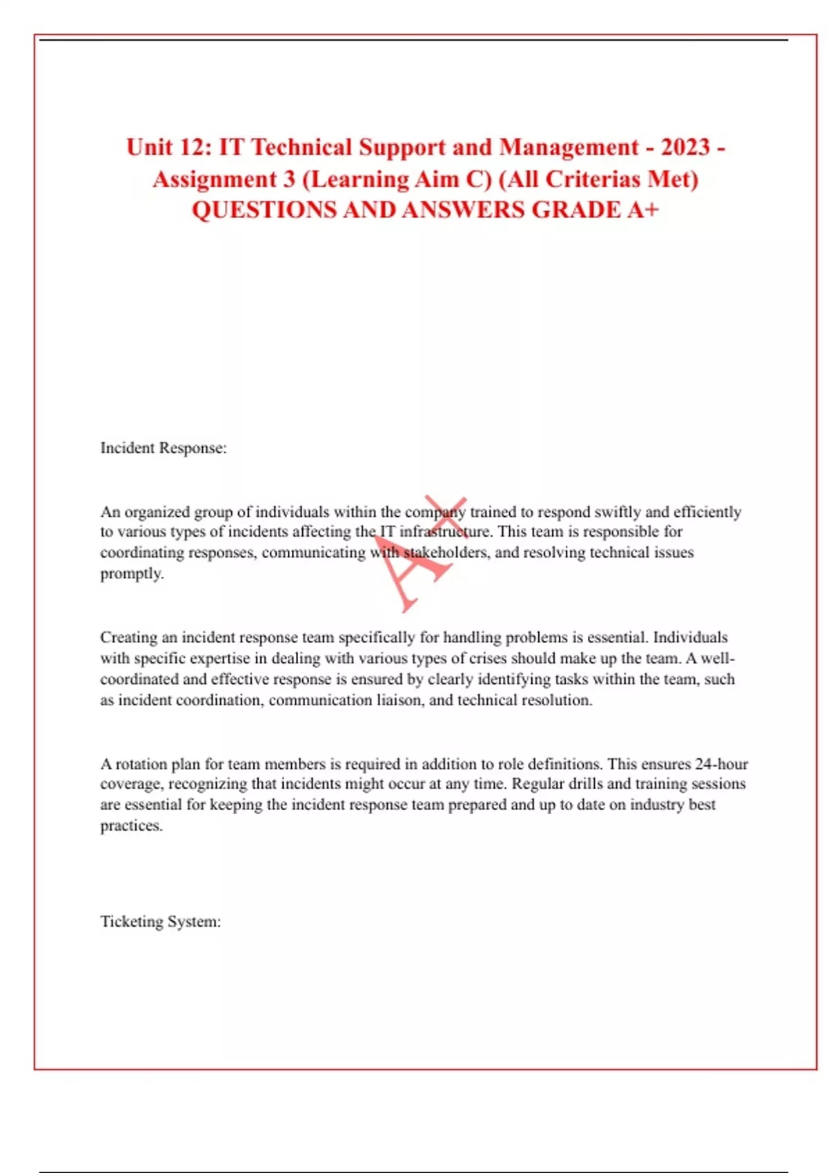 Unit 12: IT Technical Support and Management - 2023 - Assignment 3 (Learning Aim C) (All Criterias Met) QUESTIONS AND ANSWERS GRADE A+ Incident Response: An organized group of individuals within the company trained to respond swiftly and efficiently to various types of incidents affecting the IT infrastructure. This team is responsible for coordinating responses, communicating with stakeholders, and resolving technical issues promptly. Creating an incident response team specifically for handling problems is essential. Individuals with specific expertise in dealing with various types of crises should make up the team. A well-coordinated and effective response is ensured by clearly identifying tasks within the team, such as incident coordination, communication liaison, and technical resolution. A rotation plan for team members is required in addition to role definitions. This ensures 24-hour coverage, recognizing that incidents might occur at any time. Regular drills and training sessions are essential for keeping the incident response team prepared and up to date on industry best practices. Ticketing System: