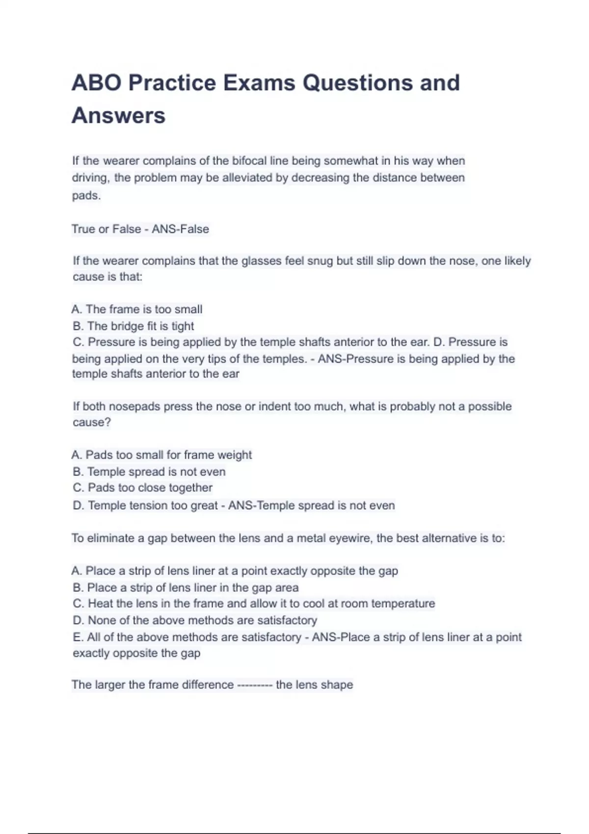 ABO Practice Exams Questions and Answers