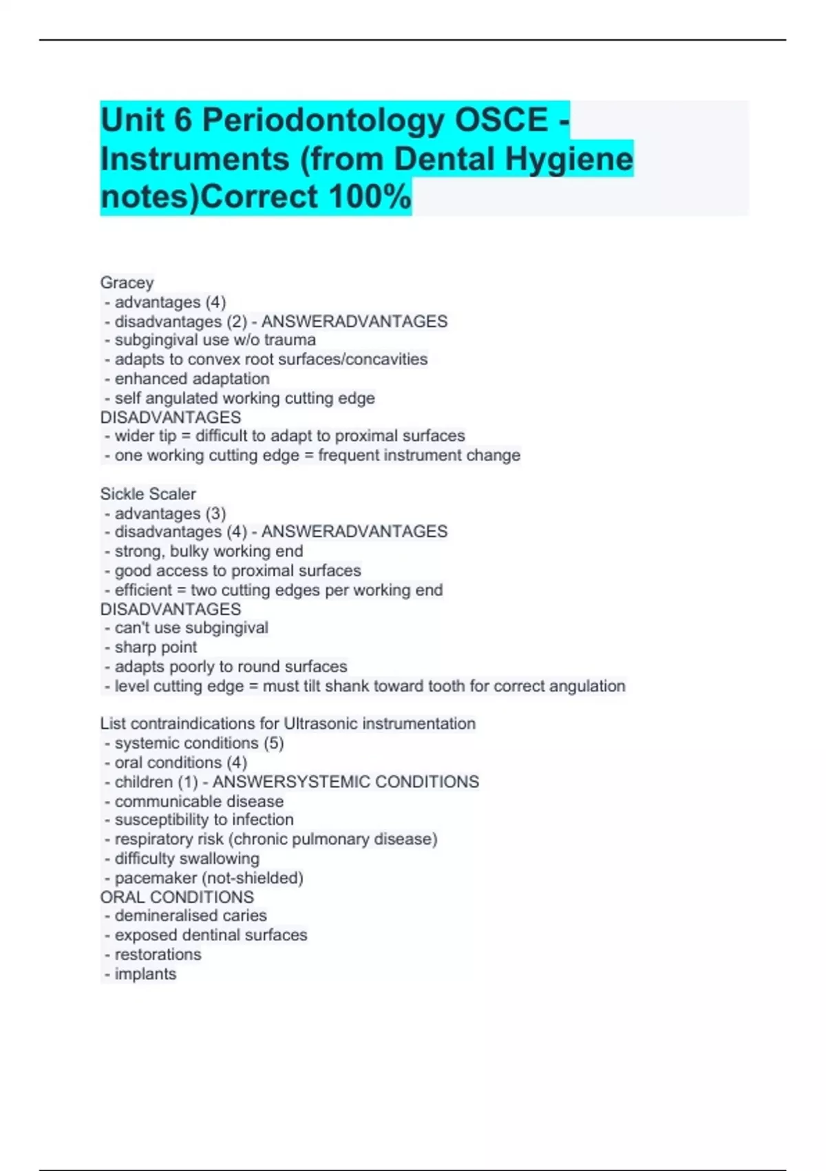 Gracey - advantages (4) - disadvantages (2) - ANSWERADVANTAGES - subgingival use w/o trauma - adapts to convex root surfaces/concavities - enhanced adaptation - self angulated working cutting edge DISADVANTAGES - wider tip = difficult to adapt to proximal surfaces - one working cutting edge = frequent instrument change Sickle Scaler - advantages (3) - disadvantages (4) - ANSWERADVANTAGES - strong, bulky working end - good access to proximal surfaces - efficient = two cutting edges per working end DISADVANTAGES - can't use subgingival - sharp point - adapts poorly to round surfaces - level cutting edge = must tilt shank toward tooth for correct angulation List contraindications for Ultrasonic instrumentation - systemic conditions (5) - oral conditions (4) - children (1) - ANSWERSYSTEMIC CONDITIONS - communicable disease - susceptibility to infection - respiratory risk (chronic pulmonary disease) - difficulty swallowing - pacemaker (not-shielded) ORAL CONDITIONS - demineralised caries - exposed dentinal surfaces - restorations - im