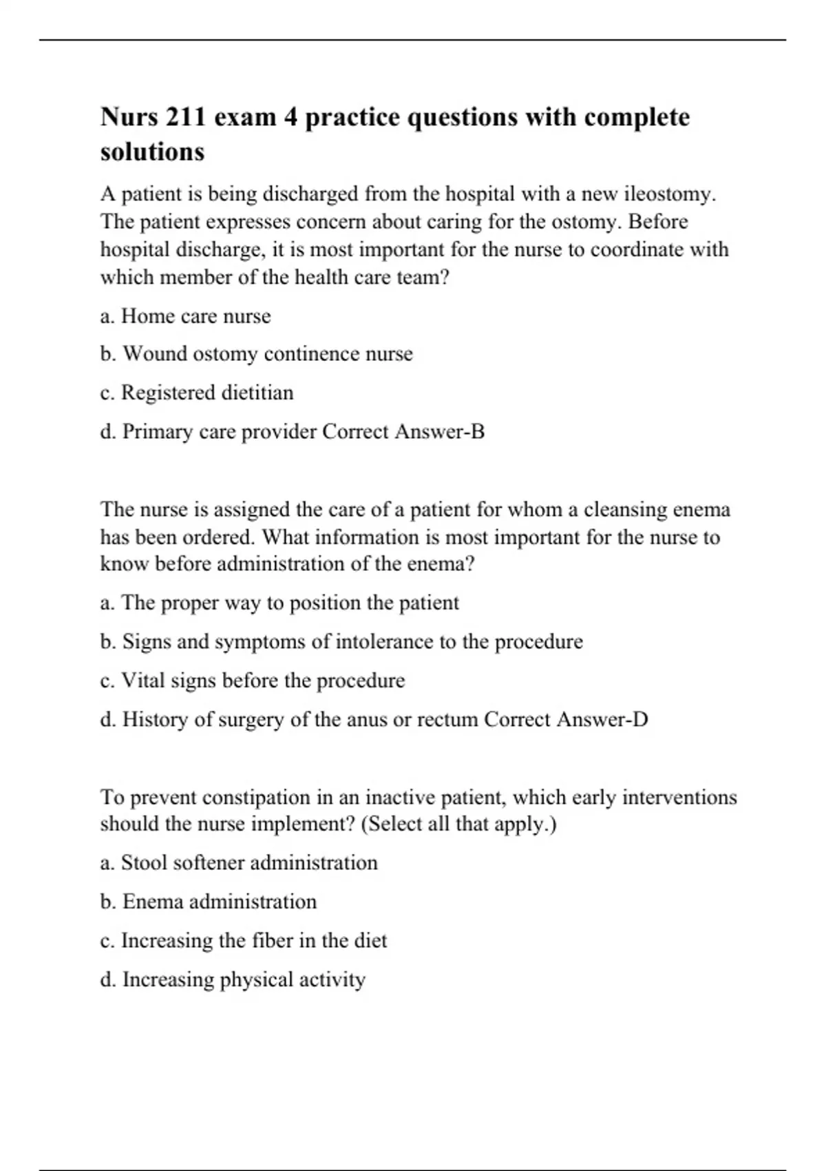 A patient is being discharged from the hospital with a new ileostomy. The patient expresses concern about caring for the ostomy. Before hospital discharge, it is most important for the nurse to coordinate with which member of the health care team? a. Home care nurse b. Wound ostomy continence nurse c. Registered dietitian d. Primary care provider Correct Answer-B The nurse is assigned the care of a patient for whom a cleansing enema has been ordered. What information is most important for the nurse to know before administration of the enema? a. The proper way to position the patient b. Signs and symptoms of intolerance to the procedure c. Vital signs before the procedure d. History of surgery of the anus or rectum Correct Answer-D To prevent constipation in an inactive patient, which early interventions should the nurse implement? (Select all that apply.) a. Stool softener administration b. Enema administration c. Increasing the fiber in the diet d. Increasing physical activity e. Increasing fluid intake Correc