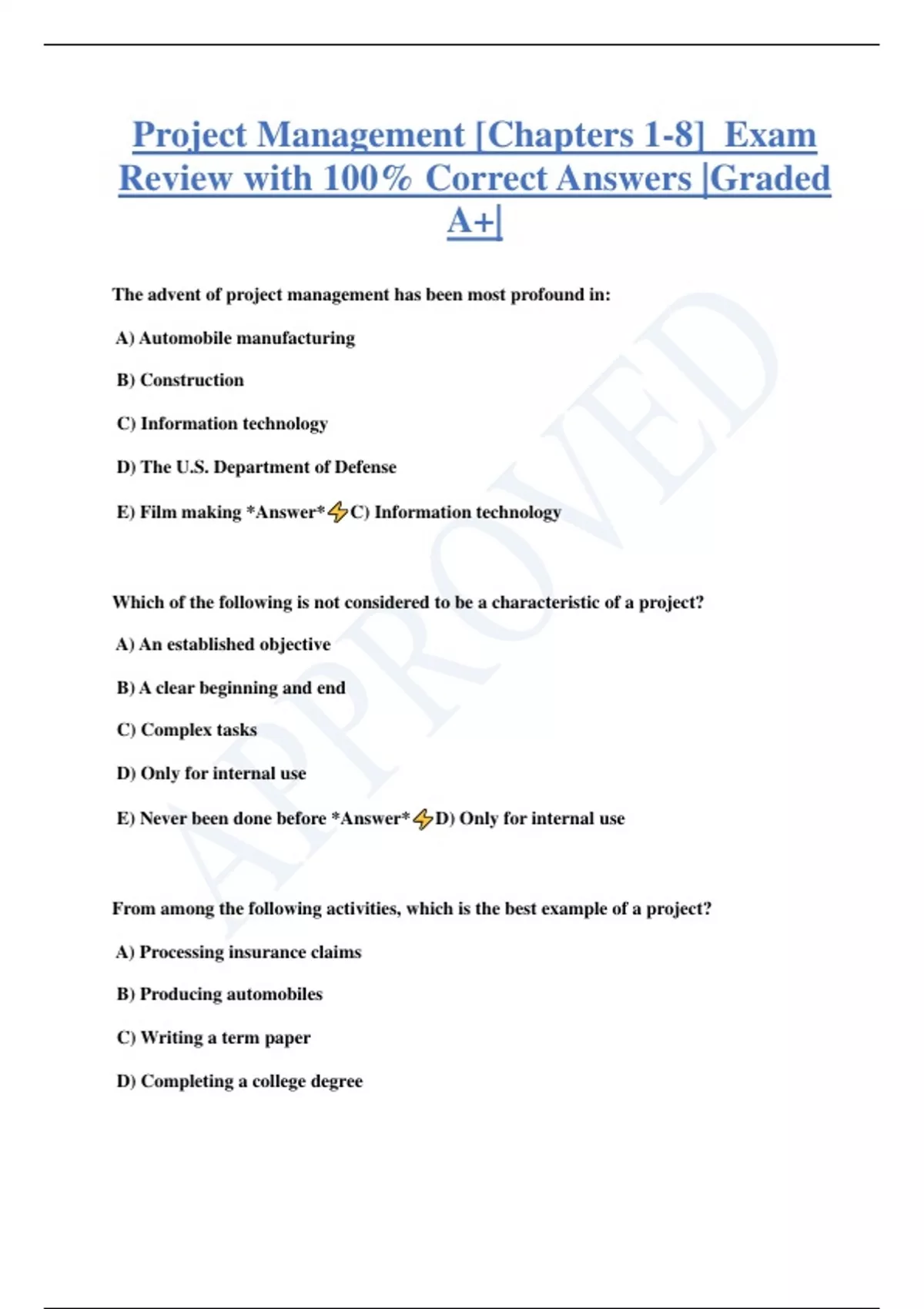 Project Management [Chapters 1-8] Exam Review with 100% Correct Answers |Graded A+| The advent of project management has been most profound in: A) Automobile manufacturing B) Construction C) Information technology D) The U.S. Department of Defense E) Film making *Answer* C) Information technology Which of the following is not considered to be a characteristic of a project? A) An established objective B) A clear beginning and end C) Complex tasks D) Only for internal use E) Never been done before *Answer* D) Only for internal use From among the following activities, which is the best example of a project? A) Processing insurance claims B) Producing automobiles C) Writing a term paper D) Completing a college degree E) All of these are good examples of projects *Answer* C) Writing a term paper Which of the following choices is not one of the stages of a project life cycle? A) Conceptualizing B) Defining C) Planning D) Executing E) Delivering *Answer* A) Conceptualizing In which of the following stages are project objectives established, teams formed, and major responsibilities assigned? A) Conceptualizing B) Defining C) Planning D) Executing E) Delivering *Answer* B) Defining In which of the following stages are you more likely to find status reports, many changes, and the creation of forecasts? A) Conceptualizing B) Defining C) Planning D) Executing E) Delivering *Answer*