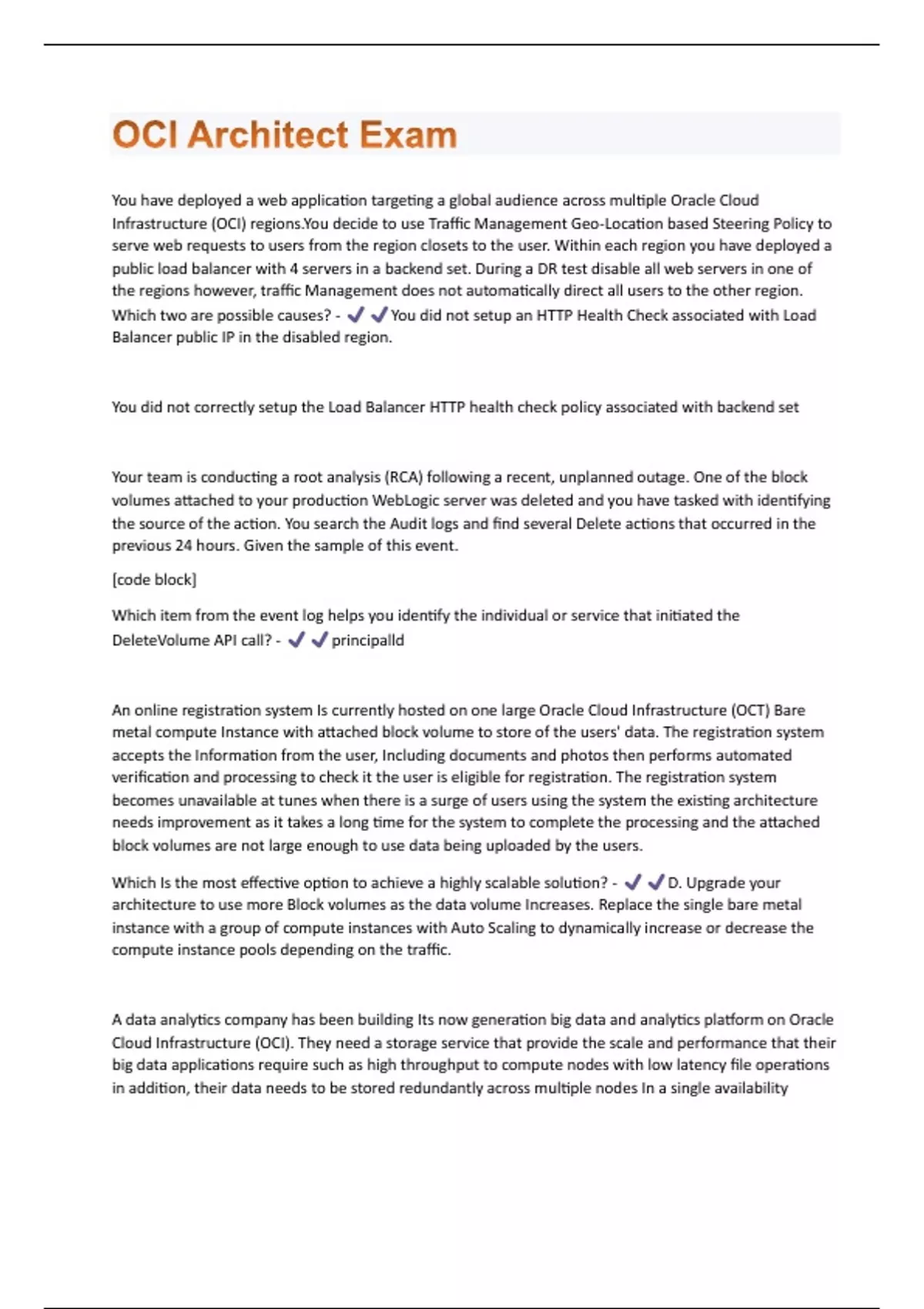 You have deployed a web application targeting a global audience across multiple Oracle Cloud Infrastructure (OCI) regions.You decide to use Traffic Management Geo-Location based Steering Policy to serve web requests to users from the region closets to the user. Within each region you have deployed a public load balancer with 4 servers in a backend set. During a DR test disable all web servers in one of the regions however, traffic Management does not automatically direct all users to the other region. Which two are possible causes? - You did not setup an HTTP Health Check associated with Load Balancer public IP in the disabled region. You did not correctly setup the Load Balancer HTTP health check policy associated with backend set Your team is conducting a root analysis (RCA) following a recent, unplanned outage. One of the block volumes attached to your production WebLogic server was deleted and you have tasked with identifying the source of the action. You search the Audit logs and find several Delete actions that occurred in the previous 24 hours. Given the sample of this event. [code block] Which item from the event log helps you identify the individual or service that initiated the DeleteVolume API call? - principalld An online registration system Is currently hosted on one large Oracle Cloud Infrastructure (OCT) Bare metal compute Instance with attached block volume to store of the users' data. The registration system accepts the Information from the user, Including documents and photos then performs automated verification and processing to check it the user is eligible for registration. The registration system becomes unavailable at tunes when there is a surge of users using the system the existing architecture needs improvement as it takes a long time for the system to complete the processing and the attached block volumes are not large enough to use data being uploaded by the users. Which Is the most effective option to achieve a highly scalable solution? - D. Upgrade your architecture to use more Block volumes as the data volume Increases. Replace the single bare metal instance with a group of compute instances with Auto Scaling to dynamically increase or decrease the compute instance pools depending on the traffic. A data analytics company has been building Its now generation big data and analytics platform on Oracle Cloud Infrastructure (OCI). They need a storage service that provide the scale and performance that their big data applications require such as high throughput to compute nodes with low latency file operations in addition, their data needs to be stored redundantly across multiple nodes In a single availabilitydomain and allows concurrent connections from multiple compute Instances hosted on multiple availability domains. Which OCI storage service can you use to meet i his requirement? - B. File System Storage You have an Oracle database system in a virtual cloud network (VCN) that needs to be accessible on port 1521 from your on-premises network CIDR 172.17.0.0/24.You have the following configuration currently.Virtual cloud network (VCD) is associated with a Dynamic Routing Gateway (DRG), and DRG has an active IPSec connection with your on-premises data center. Oracle database system is hosted in a private subnetThe private subnet route table has the following configuration The private subnet route table has following configuration. However, you are still unable to connect to the Oracle Database system. Which action will resolve this issue? - Add an EGRESS rule in private subnet scurity list as following. You have provisioned a new VM.DenseIO2.24 compute instance with local NVMe drives. The compute instance is running production application. This is a write heavy application, with a significant Impact to the business it the application goes down.What should you do to help maintain write performance and protect against NVMe devices failure. - D. Configure RAID 10 for NVMe devices. A civil engineering company is running an online portal In which engineers can upload there constructions photos, videos, and other digital files.There is a new requirement for you to implement: the online portal must offload the digital content to an Object Storage bucket for a period of 72 hours. After the provided time limit has elapsed, the portal will hold all the digital content locally and wait for the next offload period. Which option fulfills this requirement? - D. Create a pre authenticated URL for the entire Object Storage bucket to write content with an expiration of 72 hours. You are working as a solution architect for an online retail store to create a portal to allow the users to pay for their groceries using credit cards. Since the application is not fully compliant with the Payment Card Industry Data Security Standard (PCI DSS), your company is looking to use a third party payment service to process credit card payments. The third party service allows a maximum of Spelunk IP addresses 5 public IP addresses at a time However, your website is using Oracle Cloud Infrastructure (OCI) Instance Pool Auto Scaling policy to create up to create up to 15 Instances during peak traffic demand, which are launched In VCN private in VCN private subnets and attached to an OCI public Load Balancer. Upon user payment, the portal connects to the payment service over the Interne! to complete the transactionWhat solution can you implement to make sure that all compute Instances can connect to the third p - D. Route payment request from the compute instances through the OCI Load Balancer, which will then be routed to the third party service. Your customer recently ordered for a 1-Gbps Fast Connect connection In ap-tokyo-1 region of Oracle Cloud Infrastructure (OCI). They will us this to one Virtual cloud Network (VCN) in their production (OC1) tenancy and VCN In their development OC1 tenancyAs a Solution Architect, how should yon configure and architect the connectivity between on premises an