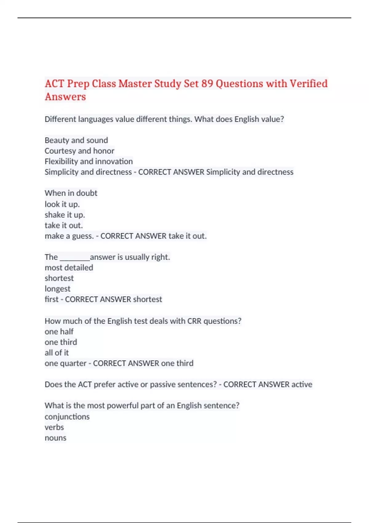 ACT Prep Class Master Study Set 89 Questions with Verified Answers Different languages value different things. What does English value? Beauty and sound Courtesy and honor Flexibility and innovation Simplicity and directness - CORRECT ANSWER Simplicity and directness When in doubt look it up. shake it up. take it out. make a guess. - CORRECT ANSWER take it out. The _______answer is usually right. most detailed shortest longest first - CORRECT ANSWER shortest How much of the English test deals with CRR questions? one half one third all of it one quarter - CORRECT ANSWER one third Does the ACT prefer active or passive sentences? - CORRECT ANSWER active What is the most powerful part of an English sentence? conjunctions verbs nouns adjectives - CORRECT ANSWER verbs If the ACT uses these punctuation marks in a sentence, it's a clue that you should really consider omit, if it is an answer choice. semicolons parentheses dashes commas - CORRECT ANSWER parentheses Consider this sentence: "The letter was written by him before he discovered her mistake." Which option is a good way to make this sentence to be more concise? She made a mistake before he wrote the letter. The letter was written by him before her mistake was discovered. Before he discovered her mistake, the letter was written by him. He wrote the letter before he discovered her mistake. - CORRECT ANSWER He wrote the letter before he discovered her mistake. Consider this text: My route home from school takes me 1.(by the cemetery, where dead people are buried.) Sometimes, it's creepy and foreboding, but other times, it's the most festive place in the landscape. 2.(On Valentine's Day, February 14, the headstones were festooned with bright metallic balloons,) dancing in the wind, longing to be part of the sky, tethered to the ground by tiny strings usually fastened around vases of vivid roses . . . What changes, if any, would you make for the first underlined portion? Omit the underlined portion by the cemetery where dead people are buried. by the cemetery. No change - CORRECT ANSWER by the cemetery Consider this text: My route home from school takes me 1. ( by the cemetery, where dead people are buried.) Sometimes, it's creepy and foreboding, but other times, it's the most festive place in the landscape. 2. ( On Valentine's Day, February 14, the headstones were festooned with bright metallic balloons,) dancing in the wind, longing to be part of the sky, tethered to the ground by tiny strings usually fastened around vases of vivid roses . . . What changes, if any, would you make for the second underlined portion? On Valentine's Day February 14, the headstones were festooned with bright metallic balloons On Valentine's Day (February 14) the headstones were festooned with bright metallic balloons, Omit the underlined portion On Valentine's Day, someone festooned the headstones with bright metallic balloons, - CORRECT ANSWER On Valentine's Day, someone festooned the headstones with bright metallic balloons, Generalization questions focus on all of these except the author's purpose. the big picture. the underlying details. the main point. - CORRECT ANSWER the underlying details. How do you attack a paired passage? Glance and Grab A, Read and Map A, Answer A. Consider the relationship between the passages. Divide and conquer. Use all of these strategies. - CORRECT ANSWER Use all of these strategies. How should I read the passages on the ACT exam? scan: like playing "slug bug" re-read: review anything you don't understand skim: skipping over connector words read: carefully, so you don't miss anything - CORRECT ANSWER skim: skipping over connector words All of these are question-stem indicators for detail questions except the author implies according to the author as stated in the passage the passage cites - CORRECT ANSWER the author implies How fast should you be reading (in words per minute) to finish the Reading Comprehension comfortably? at least 100-290 wpm at least 500-650 wpm at least 350-400 wpm at least 200-300 wpm - CORRECT ANSWER at least 350-400 wpm What are two reasons that you should you consider the relationship between the passages in a paired passage? Select all that apply. because it will help you answer the three synthesis questions at the end you actually shouldn't consider relationships between the passages because it will help you eliminate the wrong passage because it will help you remember the content better - CORRECT ANSWER because it will help you remember the content better because it will help you answer the three synthesis questions at the end What should you not pay attention to in your passage map? line numbers words like alludes, implies, supports, states, etc. how many paragraphs there are dates, names, specific diction - CORRECT ANSWER how many paragraphs there are What is the first thing you should do when you start the reading comp test? Read and map the passage. Glance and grab the questions. Make a prediction. Try to answer the questions before you read. - CORRECT ANSWER Glance and grab the questions. What are the three types of paired passages? Select all that apply. descriptive example contrasting opposing complementary - CORRECT ANSWER example contrasting complementary Fill in the blank with the homonym that correctly completes the sentence: I feel younger ____________ I used to. then than - CORRECT ANSWER than Fill in the blank with the homonym that correctly completes the sentence: Al ate _______ full meals. to too two - CORRECT ANSWER two When one decides to study for the ACT, ________ should set aside time for it every day. you people one dancers - CORRECT ANSWER one The English section may have questions that ask about a passage as a whole. To answer those questions, what should you do? Use POE to eliminate answers Pay attention to the context of the story Figure out what the thesis is Remember your Reading Comp Ninja Skills All of these - CORRECT ANSWER All of these Fill in the blank with the homony