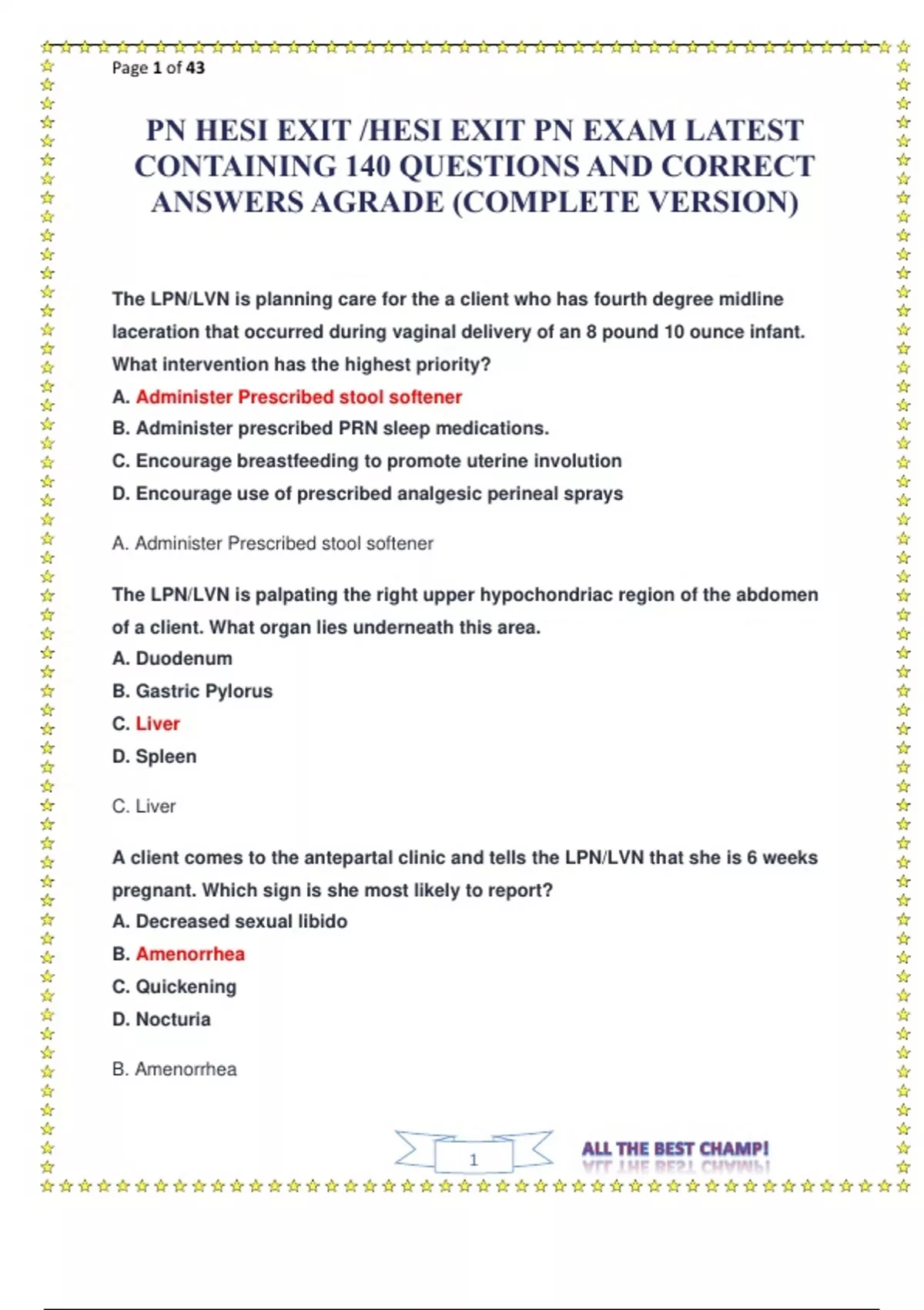 PN HESI EXIT-HESI EXIT PN EXAM LATEST CONTAINING 140 QUESTIONS AND CORRECT ANSWERS AGRADE(COMPLETE VERSION).