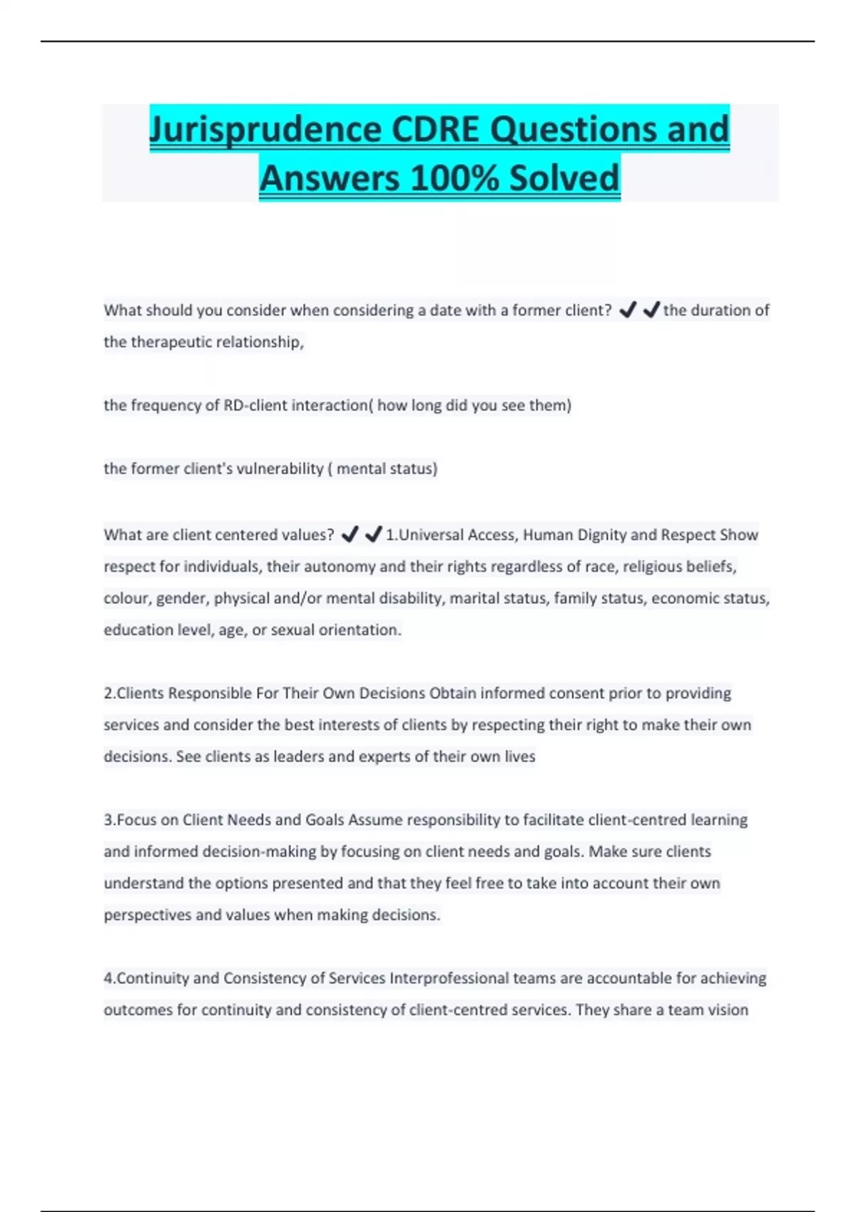 Jurisprudence CDRE Questions and Answers 100% Solved What should you consider when considering a date with a former client? ️️the duration of the therapeutic relationship, the frequency of RD-client interaction( how long did you see them) the former client's vulnerability ( mental status) What are client centered values? ️️1.Universal Access, Human Dignity and Respect Show respect for individuals, their autonomy and their rights regardless of race, religious beliefs, colour, gender, physical and/or mental disability, marital status, family status, economic status, education level, age, or sexual orientation. 2.Clients Responsible For Their Own Decisions Obtain informed consent prior to providing services and consider the best interests of clients by respecting their right to make their own decisions. See clients as leaders and experts of their own lives 3.Focus on Client Needs and Goals Assume responsibility to facilitate client-centred learning and informed decision-making by focusing on client needs and goals. Make sure clients understand the options presented and that they feel free to take into account their own perspectives and values when making decisions.