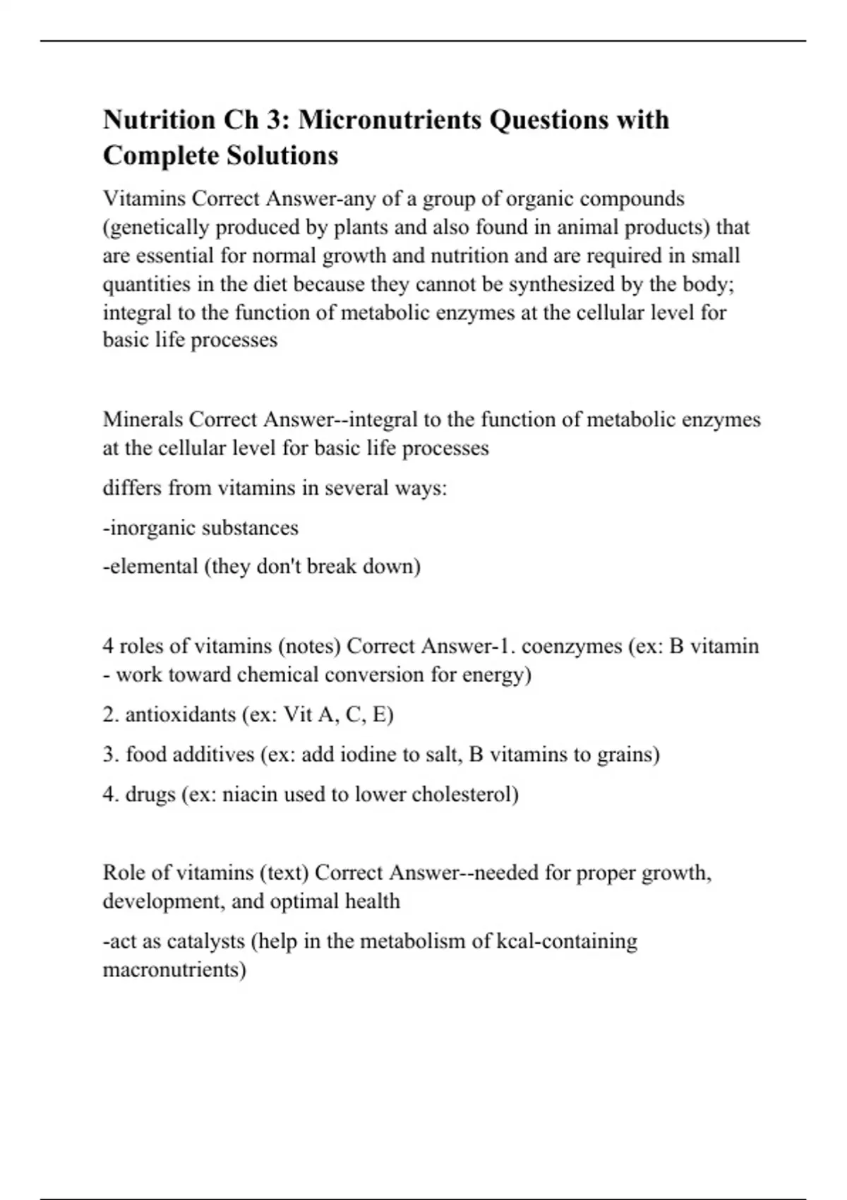 Vitamins Correct Answer-any of a group of organic compounds (genetically produced by plants and also found in animal products) that are essential for normal growth and nutrition and are required in small quantities in the diet because they cannot be synthesized by the body; integral to the function of metabolic enzymes at the cellular level for basic life processes Minerals Correct Answer--integral to the function of metabolic enzymes at the cellular level for basic life processes differs from vitamins in several ways: -inorganic substances -elemental (they don't break down) 4 roles of vitamins (notes) Correct Answer-1. coenzymes (ex: B vitamin - work toward chemical conversion for energy) 2. antioxidants (ex: Vit A, C, E) 3. food additives (ex: add iodine to salt, B vitamins to grains) 4. drugs (ex: niacin used to lower cholesterol) Role of vitamins (text) Correct Answer--needed for proper growth, development, and optimal health -act as catalysts (help in the metabolism of kcal-containing macronutrients)