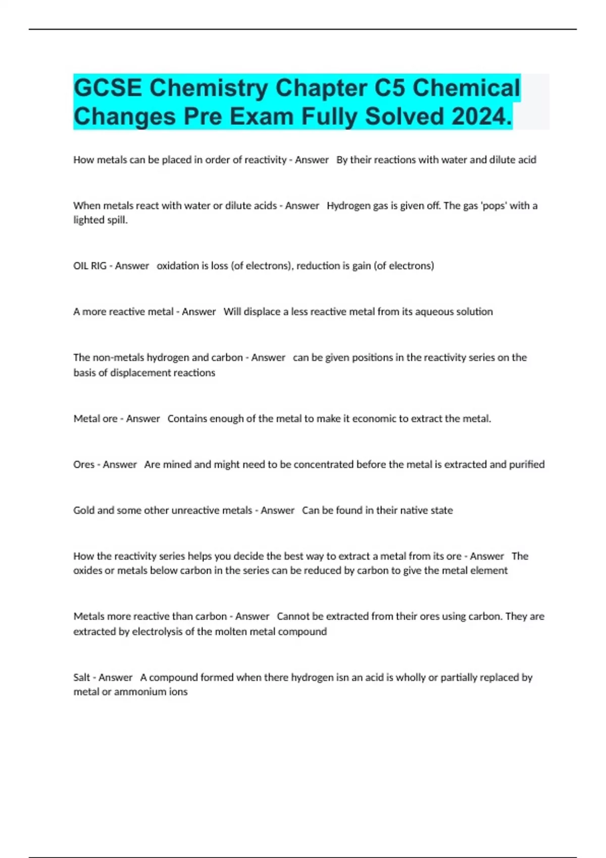 GCSE Chemistry Chapter C5 Chemical Changes Pre Exam Fully Solved 2024.