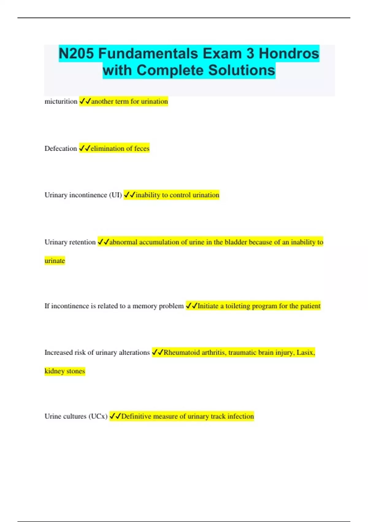 N205 Fundamentals Exam 3 Hondros with Complete Solutions micturition another term for urination Defecation elimination of feces Urinary incontinence (UI) inability to control urination Urinary retention abnormal accumulation of urine in the bladder because of an inability to urinate If incontinence is related to a memory problem Initiate a toileting program for the patient Increased risk of urinary alterations Rheumatoid arthritis, traumatic brain injury, Lasix, kidney stones Urine cultures (UCx) Definitive measure of urinary track infection If no output in Foley catheter what does a nurse do first? Check for occlusion Ways to prevent constipation Walking, exercising, eating beans, drinking prune juice, 2 to 3 L of water base fluids per day With emesis there is a concern for what? Low potassium level and dehydration What are some ways to help prevent dehydration? Drink 2 to 3 L of water base fluids a day, Drink water between meals, avoid alcohol and caffeine What can a UAP not be delegated UAPs cannot administer medication, educate patients, assessed patients, teach patients, remove disconnect or reapply appliances to patients Stress incontinence state in which the person experiences a loss of urine of less than 50 mL that occurs with increased abdominal pressure and activities Stress incontinence treatment Exercises to strengthen pelvic floor muscles (Kegel exercises) Urge incontinence involuntary leakage of urine with a sudden, strong desire to urinate. Cannot get to BR in time Urge incontinence treatment -Bladder retraining -Habit training