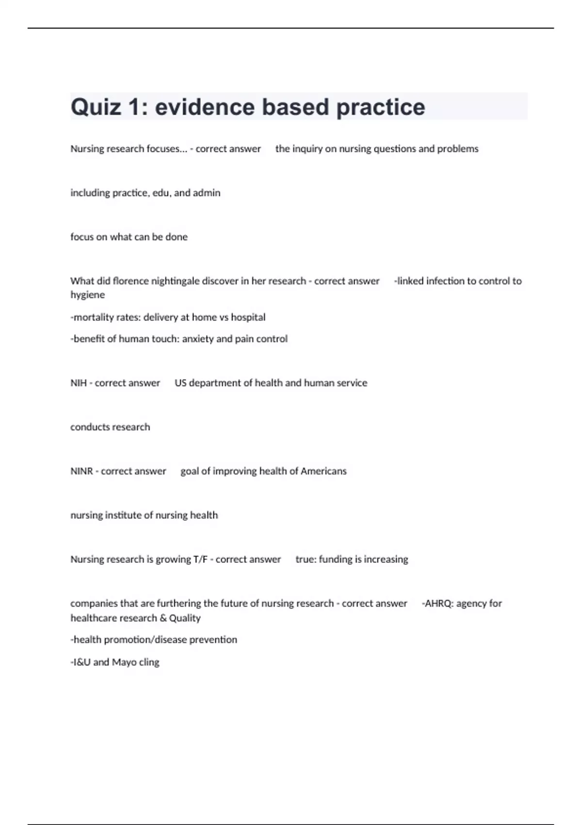 Nursing research focuses... - correct answer the inquiry on nursing questions and problems including practice, edu, and admin focus on what can be done What did florence nightingale discover in her research - correct answer -linked infection to control to hygiene -mortality rates: delivery at home vs hospital -benefit of human touch: anxiety and pain control NIH - correct answer US department of health and human service conducts research NINR - correct answer goal of improving health of Americans nursing institute of nursing health Nursing research is growing T/F - correct answer true: funding is increasing companies that are furthering the future of nursing research - correct answer -AHRQ: agency for healthcare research & Quality -health promotion/disease prevention -I&U and Mayo cling dissemination: - correct answer sharing your findings role in the nursing research - correct answer consumers and producers what is the difference btw consumer and producers - correct answer -consumers: "critical appraisal" nurses must be knowledgable consumers and able to appraise and determine the readiness of research for clinical use -producers: design and implement studies BSN and research - correct answer skills of critical appraisal MSN and research - correct answer collaboration in research process and provide clinical expertise DNP and research - correct answer conducts research Qualitative research - correct answer seeks to understand meaning of experience -natural settings -describes an experience -subective approach -theory generating Quantitative research - correct answer -seeks to test relationships or answer a question -explains cause and effect -describes a phenomena -objectivity is important -theory testing Primary/ original research articles (IMRAD) - correct answer I: introduction M: methods (how data is collected) R: results (stats) A: and D: discussion Types of articles - correct answer -research -systematic review -meta- analysis -meta-synthesis -clinical guidelines -quality improvement Evidence based practice - correct answer -clinically appropriate -cost effective -positive results -research utilization (synonymous) -typically comes from nurse research vs EBP - correct answer - research: systematic, rigorous, logical investigation to answer a phenomena -EVB: collection, interpretation and integration of research and clinical expertise qualityimprovement - correct answer systematic use of data to monitor outcome of care -improvement of methods -aim to improve quality and safety levels of evidence: level 1 - correct answer systematic review of meta-analysis of randomized controlled trials levels of evidence: level II - correct answer well designed RCT levels of evidence: level III - correct answer controlled trial without randomization levels of evidence: leve