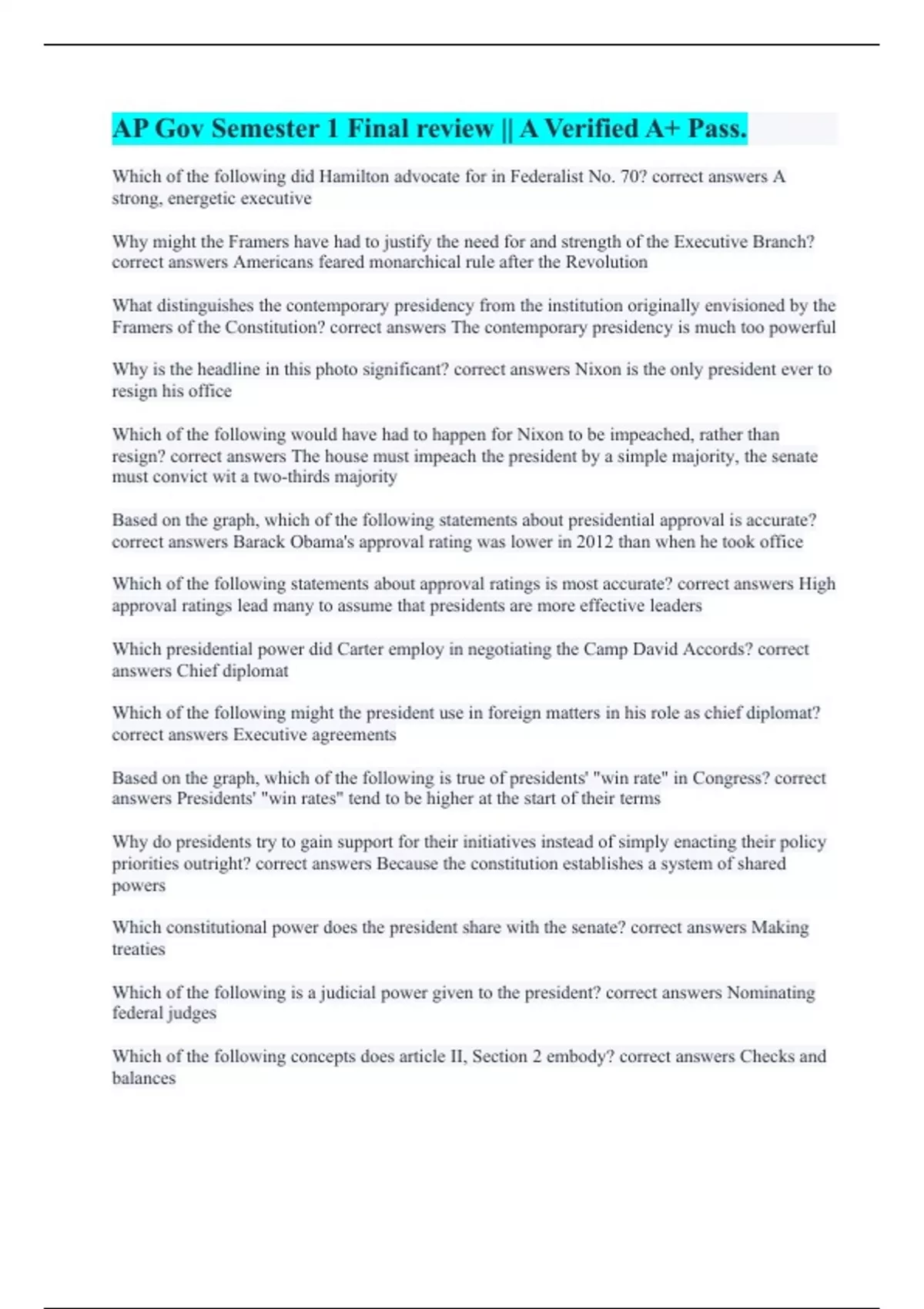 AP Gov Semester 1 Final review || A Verified A+ Pass.