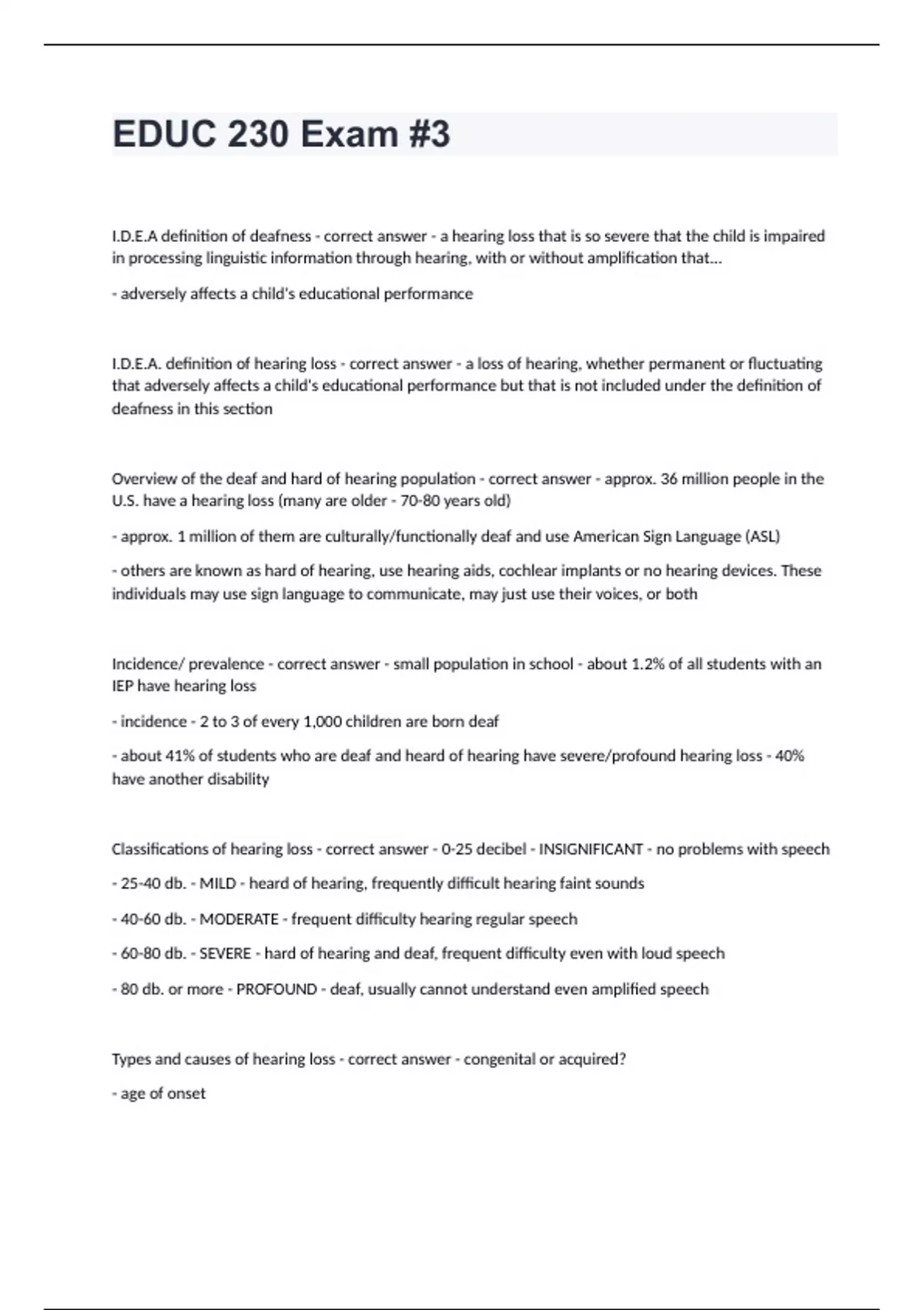 EDUC 230 Exam #3 questions with correct answersI.D.E.A definition of deafness - correct answer - a hearing loss that is so severe that the child is impaired in processing linguistic information through hearing, with or without amplification that... - adversely affects a child's educational performance I.D.E.A. definition of hearing loss - correct answer - a loss of hearing, whether permanent or fluctuating that adversely affects a child's educational performance but that is not included under the definition of deafness in this section Overview of the deaf and hard of hearing population - correct answer - approx. 36 million people in the U.S. have a hearing loss (many are older - 70-80 years old) - approx. 1 million of them are culturally/functionally deaf and use American Sign Language (ASL) - others are known as hard of hearing, use hearing aids, cochlear implants or no hearing devices. These individuals may use sign language to communicate, may just use their voices, or both Incidence/ prevalence - correct answer - small population in school - about 1.2% of all students with an IEP have hearing loss - incidence - 2 to 3 of every 1,000 children are born deaf - about 41% of students who are deaf and heard of hearing have severe/profound hearing loss - 40% have another disability