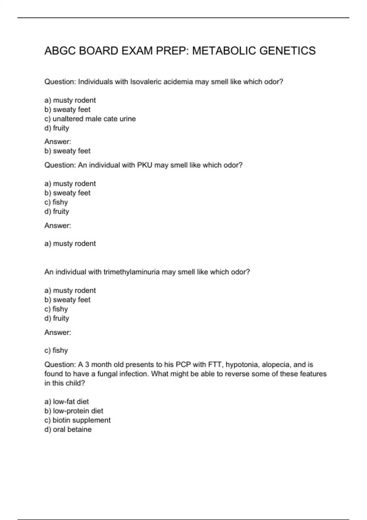 Question: Individuals with Isovaleric acidemia may smell like which odor? a) musty rodent b) sweaty feet c) unaltered male cate urine d) fruity Answer: b) sweaty feet Question: An individual with PKU may smell like which odor? a) musty rodent b) sweaty feet c) fishy d) fruity Answer: a) musty rodent An individual with trimethylaminuria may smell like which odor? a) musty rodent b) sweaty feet c) fishy d) fruity Answer: c) fishy Question: A 3 month old presents to his PCP with FTT, hypotonia, alopecia, and is found to have a fungal infection. What might be able to reverse some of these features in this child? a) low-fat diet b) low-protein diet c) biotin supplement d) oral betaine