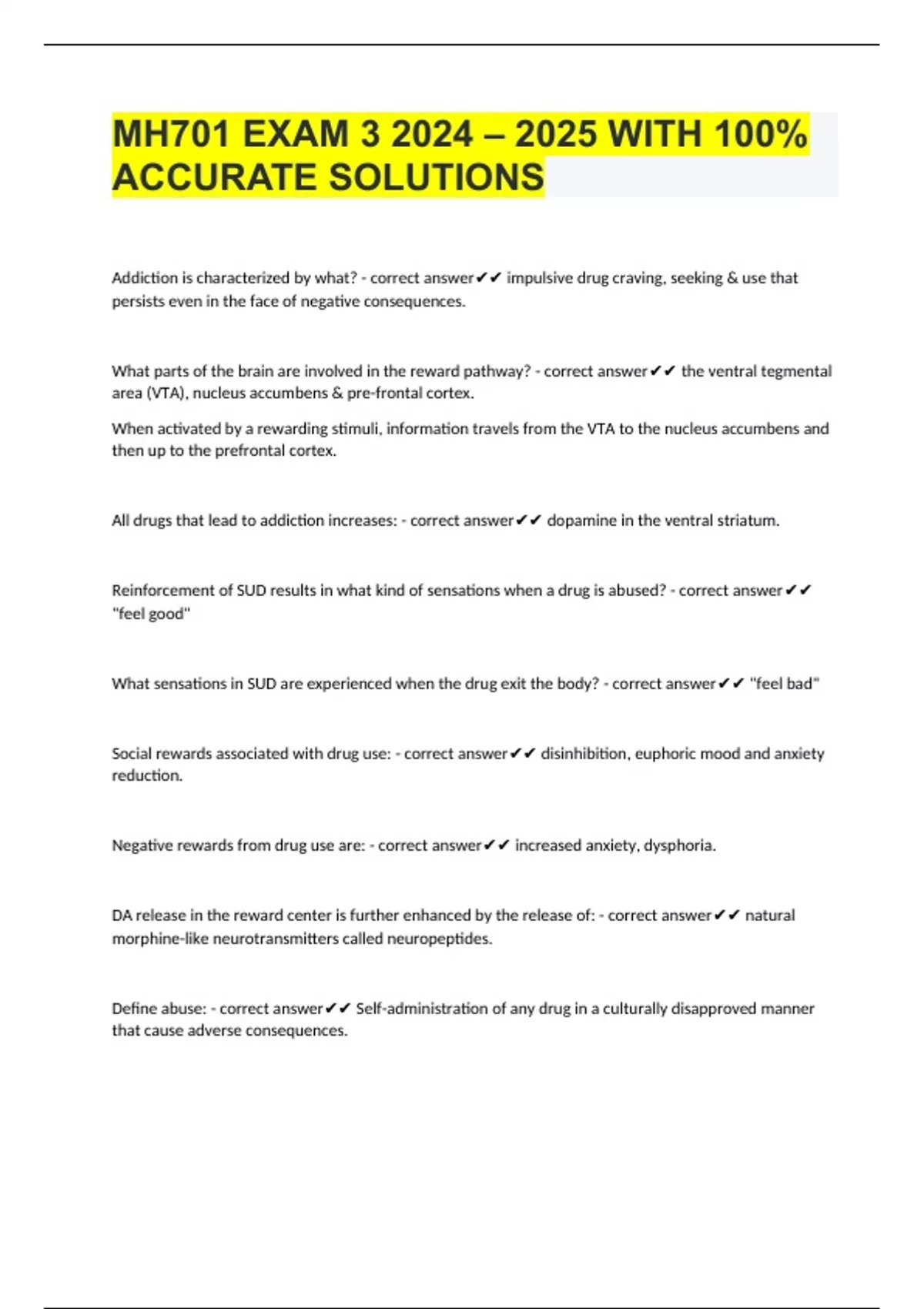 MH701 EXAM 3 2024 – 2025 WITH 100% ACCURATE SOLUTIONS Addiction is characterized by what? - correct answer impulsive drug craving, seeking & use that persists even in the face of negative consequences. What parts of the brain are involved in the reward pathway? - correct answer the ventral tegmental area (VTA), nucleus accumbens & pre-frontal cortex. When activated by a rewarding stimuli, information travels from the VTA to the nucleus accumbens and then up to the prefrontal cortex. All drugs that lead to addiction increases: - correct answer dopamine in the ventral striatum. Reinforcement of SUD results in what kind of sensations when a drug is abused? - correct answer "feel good" What sensations in SUD are experienced when the drug exit the body? - correct answer "feel bad" Social rewards associated with drug use: - correct answer disinhibition, euphoric mood and anxiety reduction.