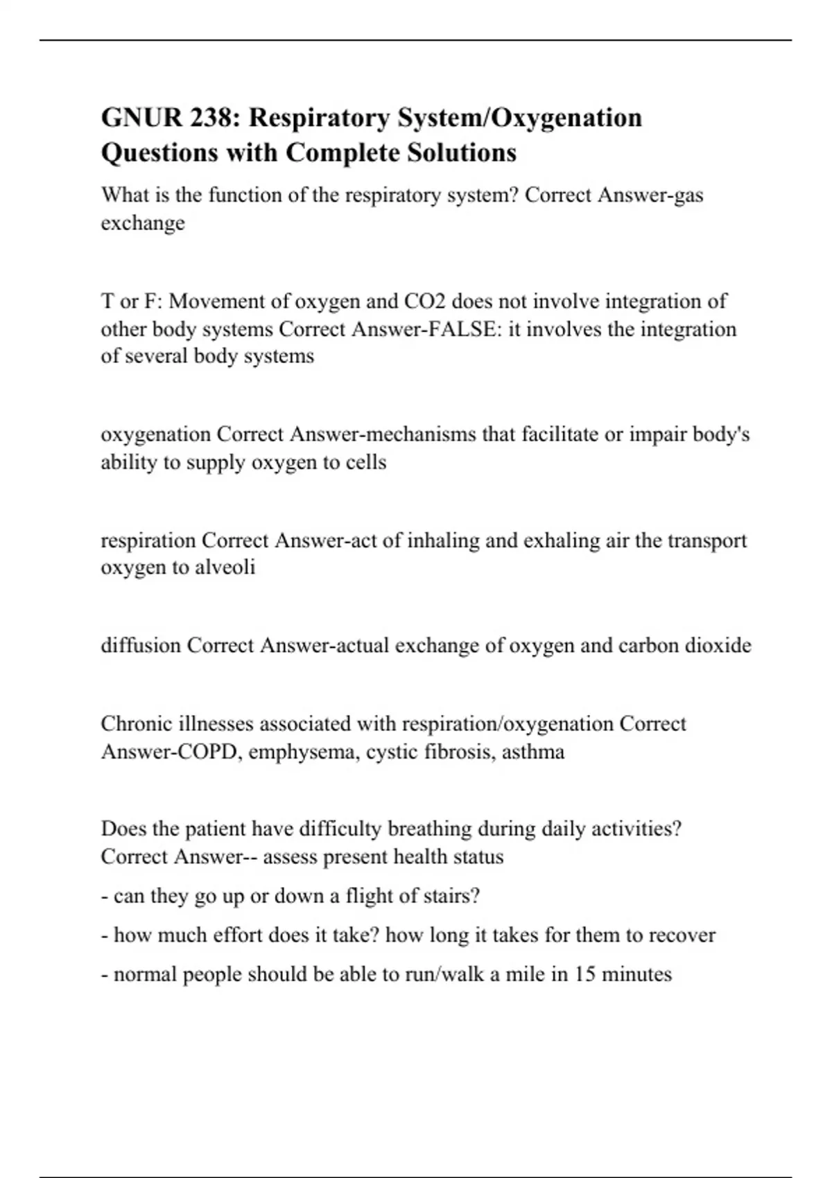GNUR 238: Respiratory System/Oxygenation Questions with Complete Solutions