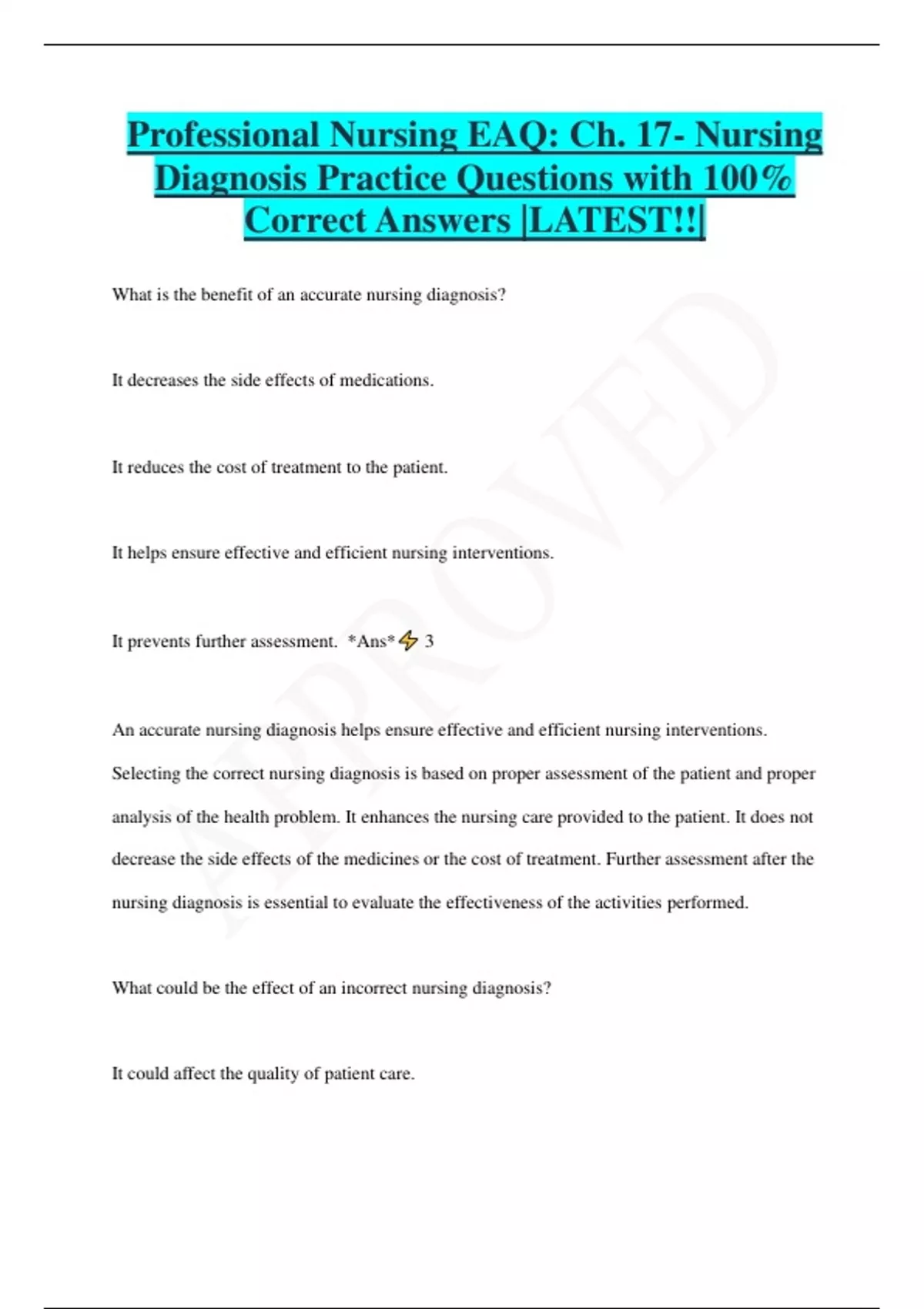 Professional Nursing EAQ: Ch. 17- Nursing Diagnosis Practice Questions with 100% Correct Answers |LATEST!!| What is the benefit of an accurate nursing diagnosis? It decreases the side effects of medications. It reduces the cost of treatment to the patient. It helps ensure effective and efficient nursing interventions. It prevents further assessment. *Ans* 3 An accurate nursing diagnosis helps ensure effective and efficient nursing interventions. Selecting the correct nursing diagnosis is based on proper assessment of the patient and proper analysis of the health problem. It enhances the nursing care provided to the patient. It does not decrease the side effects of the medicines or the cost of treatment. Further assessment after the nursing diagnosis is essential to evaluate the effectiveness of the activities performed. What could be the effect of an incorrect nursing diagnosis? It could affect the quality of patient care. It would be corrected automatically in the system. It could affect the patient's cost of treatment. It could produce a psychological disorder in the patient. *Ans* 1 An incorrect nursing diagnosis may affect the quality of patient care. Incorrect nursing diagnoses are not corrected automatically in the system. The cost of the patient's care is not dependent on the nursing diagnosis. An incorrect nursing diagnosis would not create a psychological disorder in the patient. Following an assessment, the nurse is formulating a nursing diagnosis using the PES format. What does the P in the acronym PES stand for? Period Problem Prevention Predication *Ans* 2