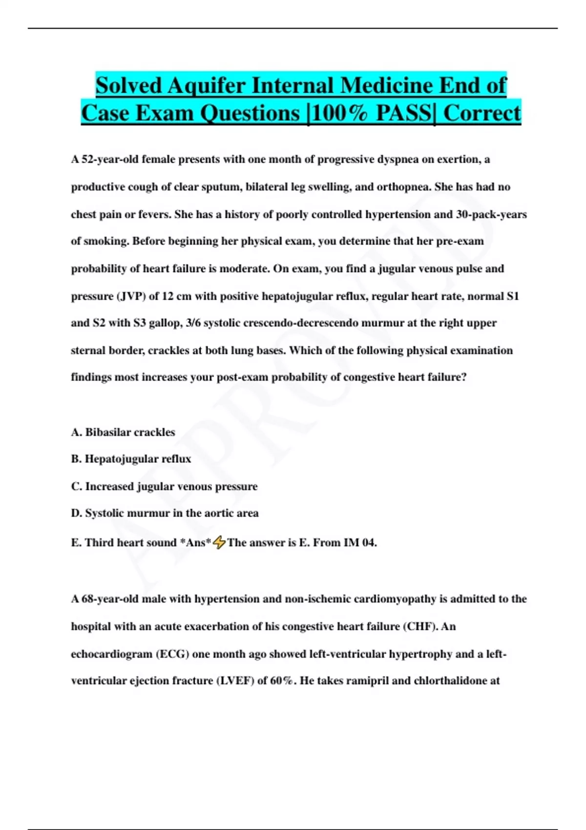 Solved Aquifer Internal Medicine End of Case Exam Questions |100% PASS| Correct A 52-year-old female presents with one month of progressive dyspnea on exertion, a productive cough of clear sputum, bilateral leg swelling, and orthopnea. She has had no chest pain or fevers. She has a history of poorly controlled hypertension and 30-pack-years of smoking. Before beginning her physical exam, you determine that her pre-exam probability of heart failure is moderate. On exam, you find a jugular venous pulse and pressure (JVP) of 12 cm with positive hepatojugular reflux, regular heart rate, normal S1 and S2 with S3 gallop, 3/6 systolic crescendo-decrescendo murmur at the right upper sternal border, crackles at both lung bases. Which of the following physical examination findings most increases your post-exam probability of congestive heart failure? A. Bibasilar crackles B. Hepatojugular reflux C. Increased jugular venous pressure D. Systolic murmur in the aortic area E. Third heart sound *Ans* The answer is E. From IM 04. A 68-year-old male with hypertension and non-ischemic cardiomyopathy is admitted to the hospital with an acute exacerbation of his congestive heart failure (CHF). An echocardiogram (ECG) one month ago showed left-ventricular hypertrophy and a leftventricular ejection fracture (LVEF) of 60%. He takes ramipril and chlorthalidone at home, and these are continued. His pulse is 85 beats/minutes, blood pressure is 134/88 mmHg, and oxygen saturation is 95% on two liters of oxygen by nasal cannula. His exam is notable for jugular venous pulse and pressure (JVP) of 12, bilateral leg edema, and crackles at his lung bases. What will be the next step in management of this man? A. Add furosemide intravenously B. Add metoprolol orally C. Add valsartan D. Increase dose of chlorthalidone E. Increase dose of ramipril *Ans* The answer is A. From IM 04. A 56-year-old female with non-ischemic cardiomyopathy and hypertension presents to the office for a routine followup. Her last hospitalization for a congestive heart failure (CHF) exacerbation was two years ago. Currently, she has no shortness of breath, orthopnea, leg edema, or chest pain. She has been following a low-salt diet and does not drink alcohol. Her medications are carvedilol and a baby aspirin. Her home blood pressure measurements have ranged from 140-150/80-90 mmHg. Her exam is notable for a blood pressure of 150/90 mmHg. Her pulse is 60 beats/minute with normal S1 and S2 with no murmurs or gallops, and she has a normal respiratory rate. Her jugular venous pulse and pressure (JVP) is normal and her lungs are clear. Her point of maximal impulse (PMI) is laterally displaced. What medication should you add that can also improve her mortality from heart f
