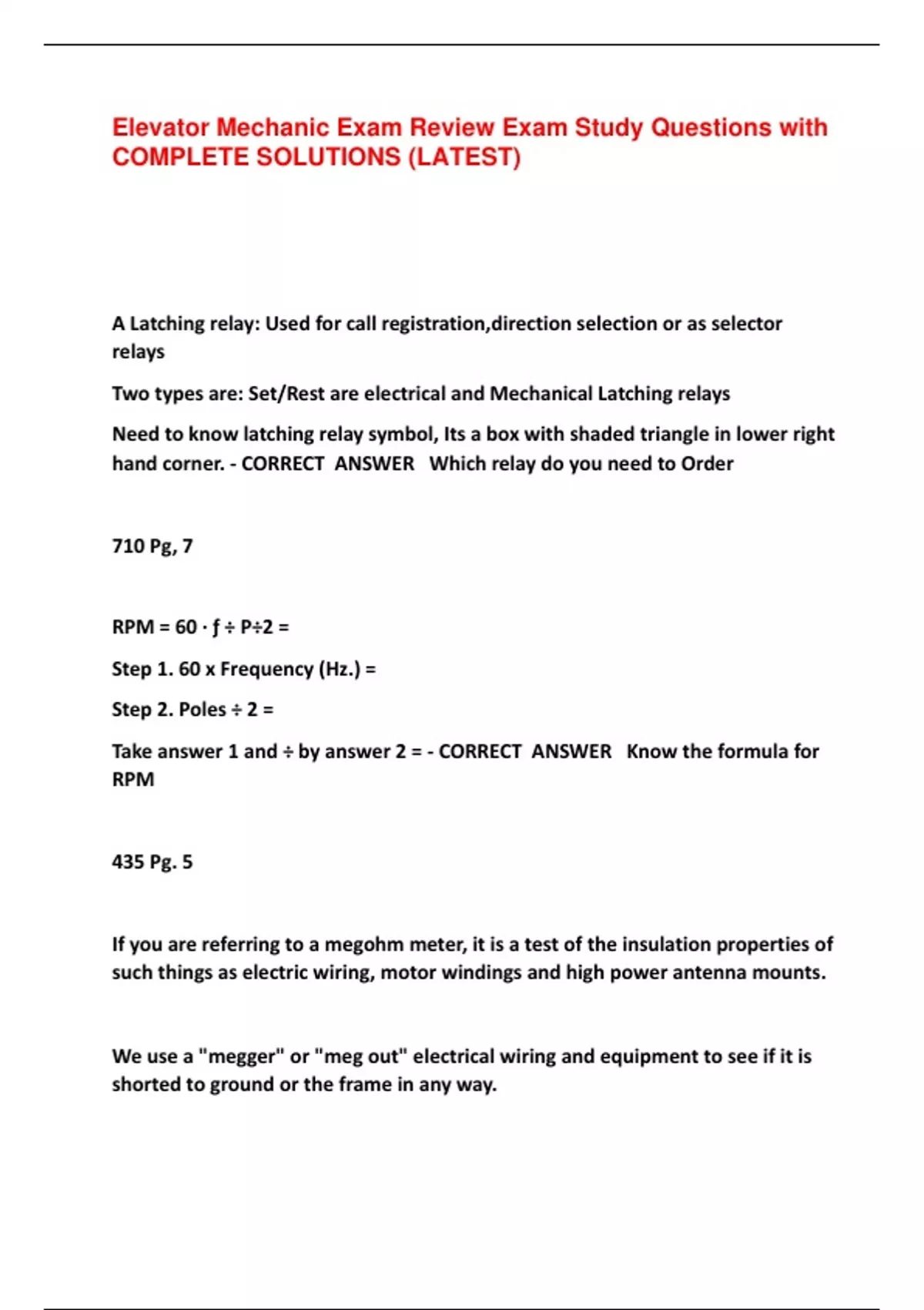 Elevator Mechanic Exam Review Exam Study Questions with COMPLETE SOLUTIONS (LATEST) A Latching relay: Used for call registration,direction selection or as selector relays Two types are: Set/Rest are electrical and Mechanical Latching relays Need to know latching relay symbol, Its a box with shaded triangle in lower right hand corner. - CORRECT ANSWER Which relay do you need to Order 710 Pg, 7 RPM = 60 ∙ ƒ ÷ P÷2 = Step 1. 60 x Frequency (Hz.) = Step 2. Poles ÷ 2 = Take answer 1 and ÷ by answer 2 = - CORRECT ANSWER Know the formula for RPM 435 Pg. 5 If you are referring to a megohm meter, it is a test of the insulation properties of such things as electric wiring, motor windings and high power antenna mounts. We use a "megger" or "meg out" electrical wiring and equipment to see if it is shorted to ground or the frame in any way.