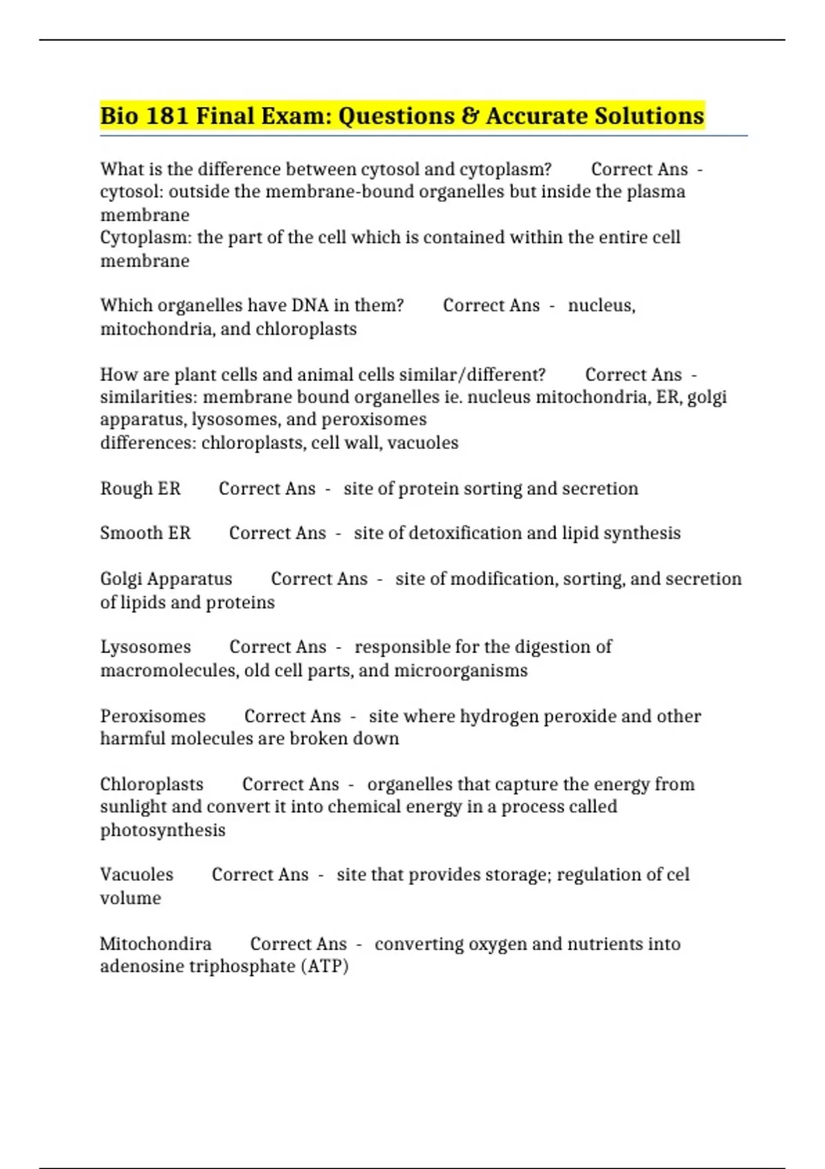 bio 181 final exam questions accurate solutions