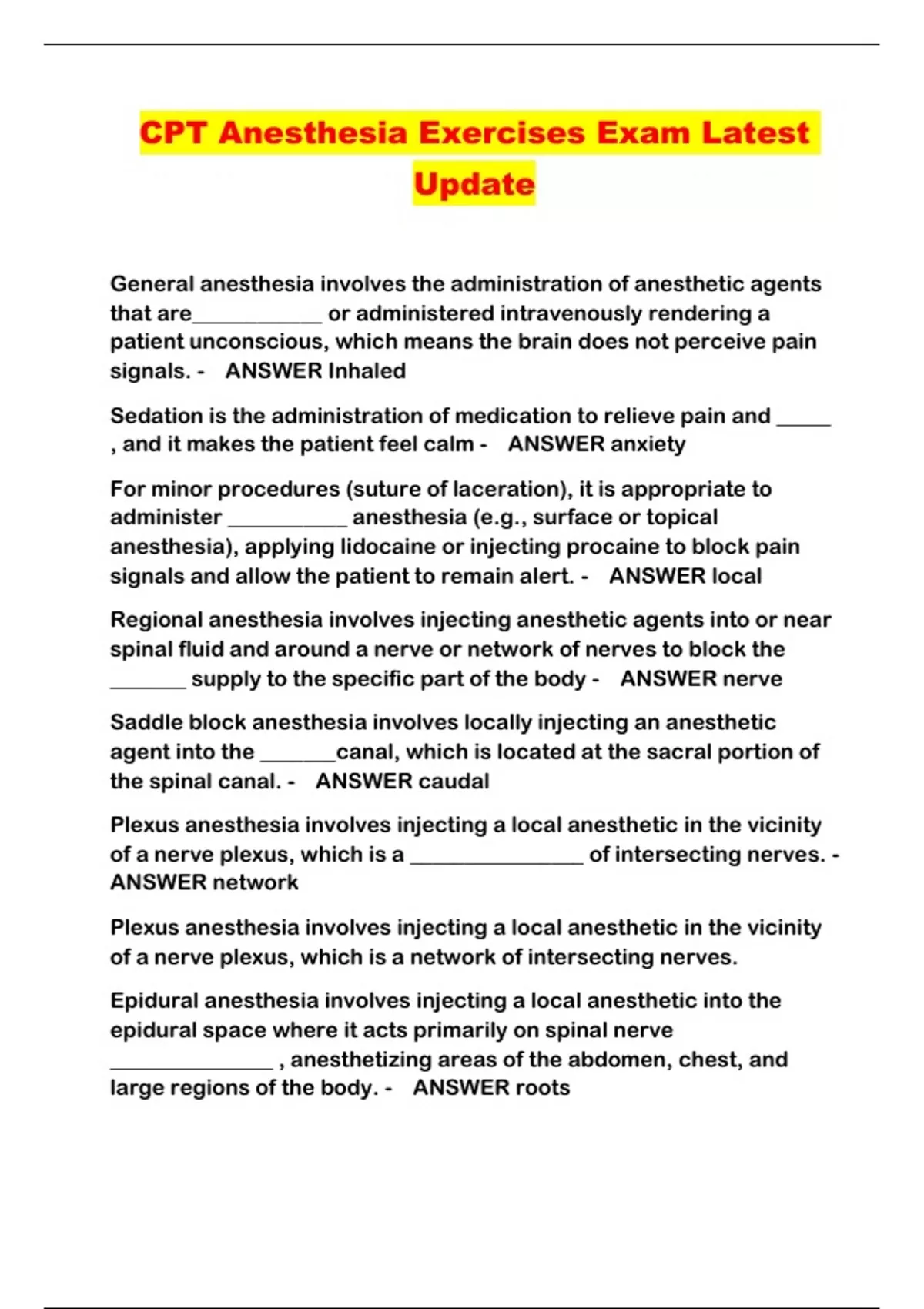 CPT Anesthesia Exercises Exam Latest Update...