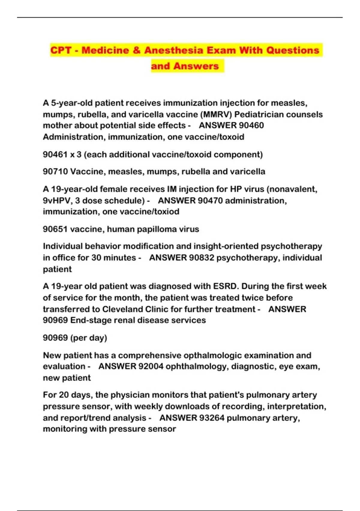CPT - Medicine & Anesthesia Exam With Questions and Answers ...