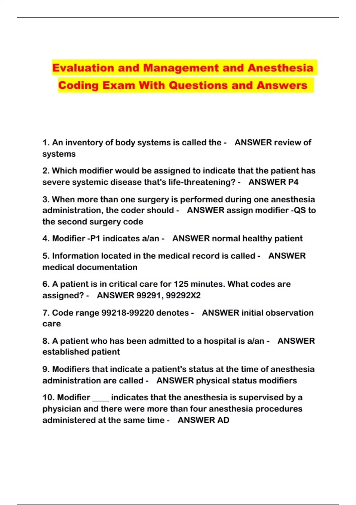 Evaluation and Management and Anesthesia Coding Exam With Questions and Answers ...