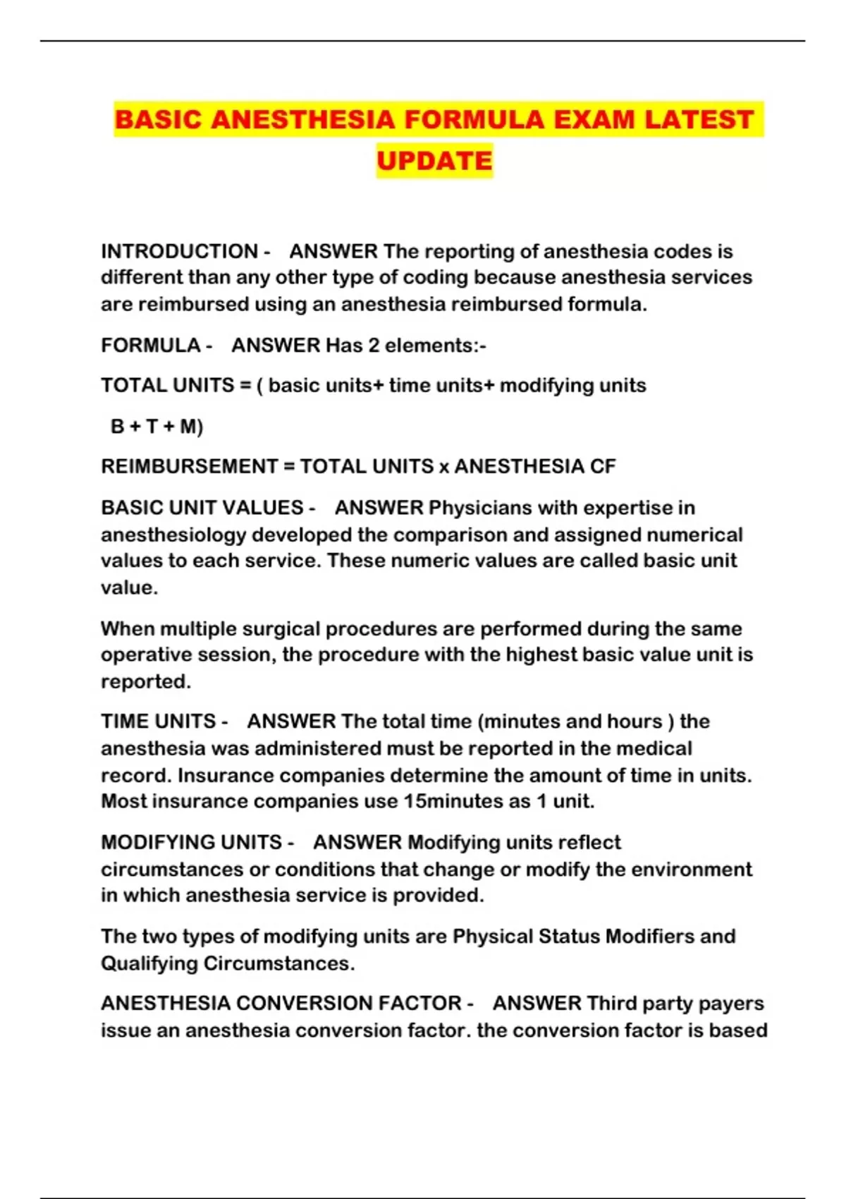 BASIC ANESTHESIA FORMULA EXAM LATEST UPDATE
