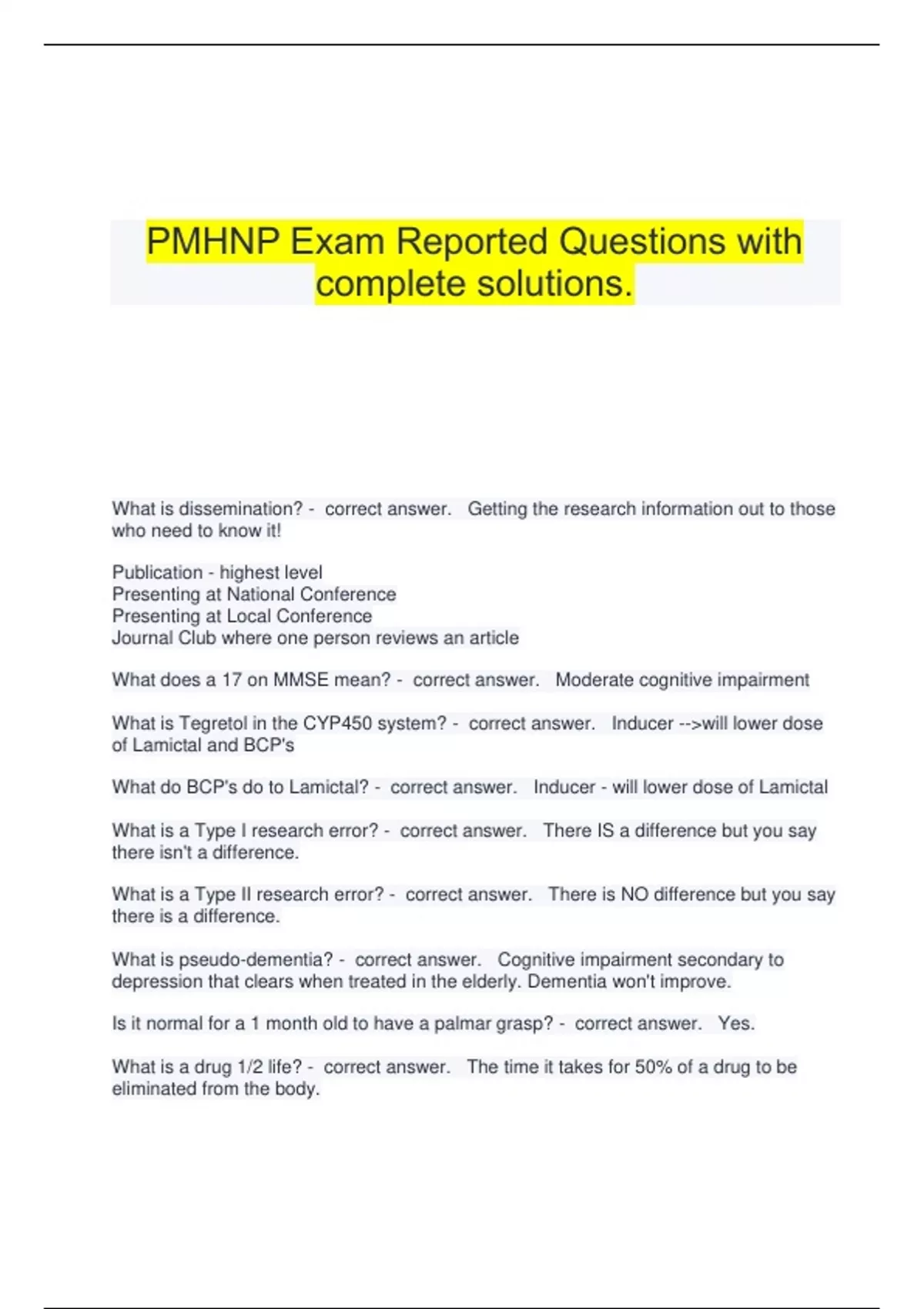 PMHNP Exam Reported Questions with complete solutions. What is dissemination? - correct answer. Getting the research information out to those who need to know it! Publication - highest level Presenting at National Conference Presenting at Local Conference Journal Club where one person reviews an article What does a 17 on MMSE mean? - correct answer. Moderate cognitive impairment What is Tegretol in the CYP450 system? - correct answer. Inducer --will lower dose of Lamictal and BCP's What do BCP's do to Lamictal? - correct answer. Inducer - will lower dose of Lamictal What is a Type I research error? - correct answer. There IS a difference but you say there isn't a difference. What is a Type II research error? - correct answer. There is NO difference but you say there is a difference. What is pseudo-dementia? - correct answer. Cognitive impairment secondary to depression that clears when treated in the elderly. Dementia won't improve. Is it normal for a 1 month old to have a palmar grasp? - correct answer. Yes. What is a drug 1/2 life? - correct answer. The time it takes for 50% of a drug to be eliminated from the body. What 3 atypicals can be used with teens? - correct answer. Zyprexa, Abilify, Seroquel - low doses What is a risk of using Tramadol? - correct answer. Serotonin Syndrome as it is very serotonergic. What is the allele seen in Asians that increase the risk of SJS? - correct answer. HLAB-1502 When might you see toxic epidermal necrolysis? - correct answer. With worsening of SJS How many generations do you include for a genogram? - correct answer. 1st degree - mother, father, siblings 2nd degree - grandparents & cousins 3rd degree - What does messenger RNA code for? - correct answer. Amino Acids What is epigenetics? - correct answer. Factors that affect genes - environmental, smoking, stress, etc... What part of the brain is involved with OCD? - correct answer. Basal Ganglia Occipito-Frontal What happens to the brain during adolescence? - correct answer. Dendritic pruning Emotions are controlled by amygdala By adulthood, PFC involved as well When do males typically present with schizophrenia? - correct answer. 10-25 yo When do females typically present with schizophrenia? - correct answer. 25-35 yo What does Erythromycin to trileptal? - correct answer. You will need to decreases the level because Trileptal(inducer) and erythromycin is a inhibitor ACE Inhibitors are the drug of choice for what? - correct answer. Heart Failure HTN What are some psychiatric side effects seen with some asthma drugs - correct answer. Leukotriene receptor agonists - singulair, accolade, zyflo = agitation, aggression, anxiety, hallucinations, depression, insomnia, SI, tremor What should you watch for with Tegretol? - correct answer. Agranulocytosis and Hyponatremia What are the 3 CK muscle enzyme tests? - correct answer. CKBB, CKMM, CKMB Which one of the 3 muscle enzymes are related to cardiac muscle damage? - correct answer. CKMB What is the risk of a seriously elevated CKMB? - correct answer. Polymyositis Rhabdo What is a normal CKMB? - correct answer. 0.3 mcg/L What psychoactives does Detrol interact with? - correct answer. Topamax KCL Zonegran What CN are you assessing when you have the patient shrug their shoulders? - correct answer. CN XI - Spinal Accessory What do you see in labs with HIV & Dementia? - correct answer. CD4 200 Viral Load is high 20% get it with antiretroviral treatment What is the scoring with the Beck Depression Inventory? - correct answer. Self-Report - 0-63 0-13 - minimal 14-19 - mild 20-28 - moderate 29-63 - severe What is sensitivity? - correct answer. Helps rule-out disease = True Positive = Snout What is specificity? - correct answer. Helps rule-in disease = True Negative = Spin What does a sed rate measure? - correct answer. Inflammation (ESR - Erythrocyte Sedimentation Rate) = distance in mm RBC's have descended in 1 hour. What is a normal sed rate or ESR? - correct answer. 0-22 males 0-29 females What is a retic count? - correct answer. Measures % of reticulocytes in blood (immature RBC's) Indicates whether enough RBC's are being produced by bone marrow. What does a decreased retic count indicate? - correct answer. Anemia - acute or chronic bleeding What does an increased retic count indicate? - correct answer. Bone marrow disorder or Vitamin Deficiency What does an abnormal retic ount indicate in general? - correct answer. Doesn't diagnose anything. First step is ID source of the issue. What happens when you mix tegretol and macrolides? - correct answer. Increase tegretol levels. What happens if a pregnant women takes Accutane? - correct answer. Birth defects. What labs do you get with RA? - correct answer. Sed rate, RF, ANA, C reactive protein, CBC, CMP, CRP - helps confirm diagnosis. CRP and ESR are both increased in RA but NOT in osteoarthritis. Where does the NP Code of Ethics come from? - correct answer. ANA When do you assume informed consent? - correct answer. Unconscious Incompetent Life Threatening Situation What are the legal ramifications of treating w/o informed consent? - correct answer. Same as with informed consent Who can declare a patient incompetent and appoint a guardian? - correct answer. Only a court Does impaired judgment mean one is incompetent? - correct answer. No. Can an advanced directive ever be revoked? - correct answer. Yes, at any time. What is the different between a Healthcare Agent, Proxy, Surrogate, and Attorney in Fact? - correct answer. Nothing. They are all the same. Does the de facto rule of proxy apply in same sex marriages? - correct answer. No. How do Asians see HC providers? - correct answer. As in a position of authority. Expect to give instructions and help make decisions What does it mean when an Asian patient does not make eye contact with the NP? - correct answer. SIgn of respect What is the evil eye? - correct answer. When a stronger or more powerful person looks at a weaker person - often infant/child resulting in a hex