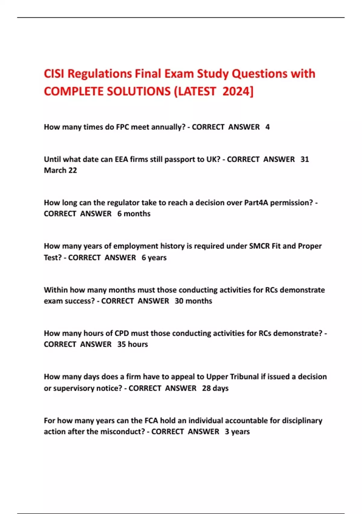 CISI Regulations Final Exam Study Questions with COMPLETE SOLUTIONS (LATEST 2024] How many times do FPC meet annually? - CORRECT ANSWER 4 Until what date can EEA firms still passport to UK? - CORRECT ANSWER 31 March 22 How long can the regulator take to reach a decision over Part4A permission? - CORRECT ANSWER 6 months How many years of employment history is required under SMCR Fit and Proper Test? - CORRECT ANSWER 6 years Within how many months must those conducting activities for RCs demonstrate exam success? - CORRECT ANSWER 30 months How many hours of CPD must those conducting activities for RCs demonstrate? - CORRECT ANSWER 35 hours How many days does a firm have to appeal to Upper Tribunal if issued a decision or supervisory notice? - CORRECT ANSWER 28 days For how many years can the FCA hold an individual accountable for disciplinary action after the misconduct? - CORRECT ANSWER 3 year
