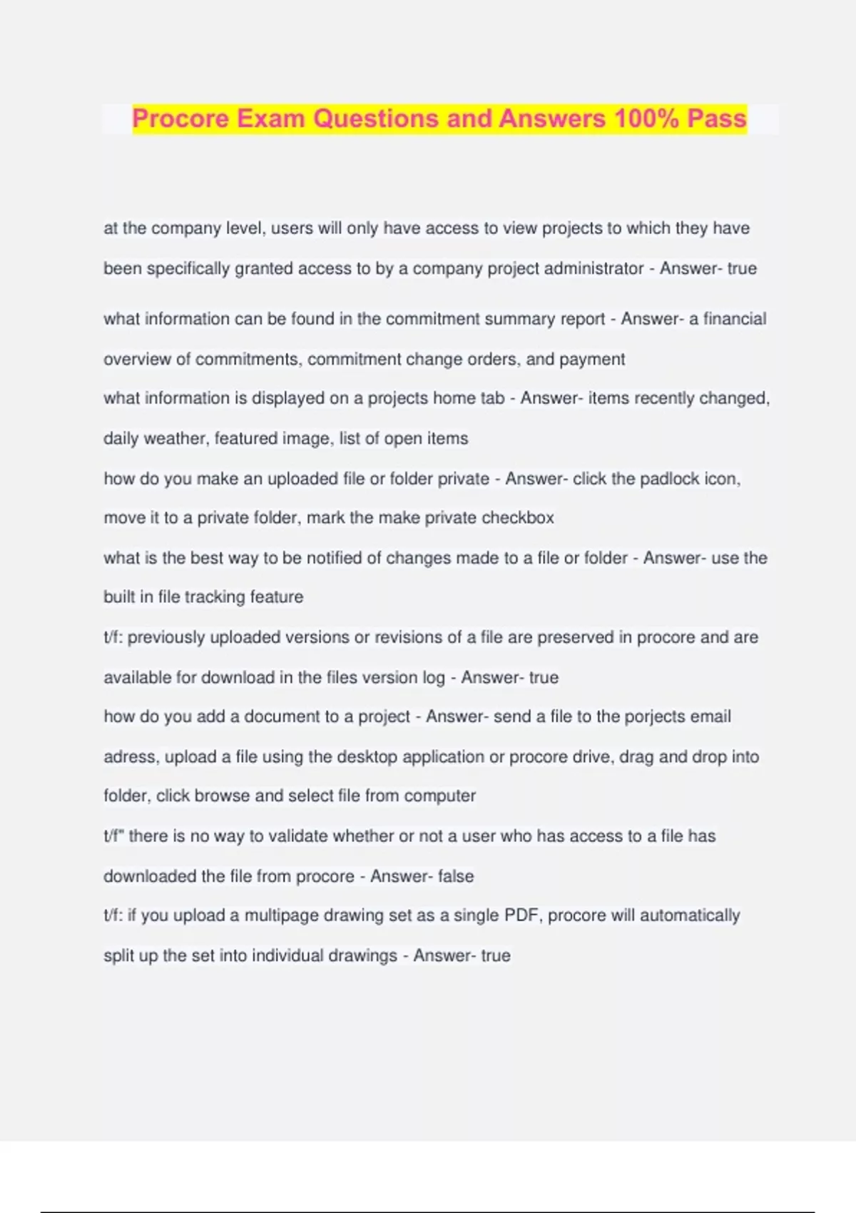 Procore Exam Questions and Answers 100% Pass at the company level, users will only have access to view projects to which they have been specifically granted access to by a company project administrator - Answer- true what information can be found in the commitment summary report - Answer- a financial overview of commitments, commitment change orders, and payment what information is displayed on a projects home tab - Answer- items recently changed, daily weather, featured image, list of open items how do you make an uploaded file or folder private - Answer- click the padlock icon, move it to a private folder, mark the make private checkbox what is the best way to be notified of changes made to a file or folder - Answer- use the built in file tracking feature t/f: previously uploaded versions or revisions of a file are preserved in procore and are available for download in the files version log - Answer- true how do you add a document to a project - Answer- send a file to the porjects email adress, upload a file using the desktop application or procore drive, drag and drop into folder, click browse and select file from computer t/f" there is no way to validate whether or not a user who has access to a file has downloaded the file from procore - Answer- false t/f: if you upload a multipage drawing set as a single PDF, procore will automatically split up the set into individual drawings - Answer- true once a drawing has been reviewed and published, which data fields can still be edited/changed - Answer- number, title, revisioni number, dates, discipline t/f: when you review uploaded drawings and manualy correct/edit auto filled drawing title/number, procre readjusts it processing algorithm for the remainder of the drawings - Answer- true when reviewing an uploaded drawing, what can you not perform - Answer- adding markups to the drawing what locations can you not upload drawings from - Answer- the projects email tool when reviewing an uploaded drawing which corner is automically displayed - Answer- bottom right when you click clear after performing a keyword search, both filter and search settings are reset to default - Answer- false the only way to make your personal markups visible to others is by publishing them to become visible on the drawings published layer - Answer- true what happens when you click the icon with the arrow pointing into the bar - Answer- it will download a pdf of the current drawing revision to your computer when you click a projects drawing tool, you should expect to see the projects current set of drawings (aka most recent) - Answer- true what is the best way to view the chagnes between different reviisons of an uploaded drawing - Answer- use the compare revisions feature to view highlighted changes who can view drawing markups on the personal layer - Answer- only you why are some action buttons inactive and grey - Answer- because certain actions require that you first select one or more spec sections before the button becomes clickable/orange when you upload a projects specs into procore, you must upload t