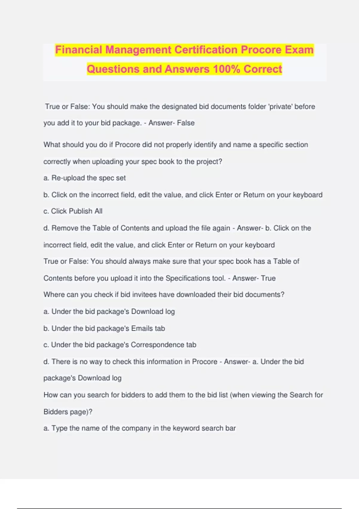 Financial Management Certification Procore Exam Questions and Answers 100% Correct True or False: You should make the designated bid documents folder 'private' before you add it to your bid package. - Answer- False What should you do if Procore did not properly identify and name a specific section correctly when uploading your spec book to the project? a. Re-upload the spec set b. Click on the incorrect field, edit the value, and click Enter or Return on your keyboard c. Click Publish All d. Remove the Table of Contents and upload the file again - Answer- b. Click on the incorrect field, edit the value, and click Enter or Return on your keyboard True or False: You should always make sure that your spec book has a Table of Contents before you upload it into the Specifications tool. - Answer- True Where can you check if bid invitees have downloaded their bid documents? a. Under the bid package's Download log b. Under the bid package's Emails tab c. Under the bid package's Correspondence tab d. There is no way to check this information in Procore - Answer- a. Under the bid package's Download log How can you search for bidders to add them to the bid list (when viewing the Search for Bidders page)? a. Type the name of the company in the keyword search bar b. Filter by trades or cost codes c. Filter by jobsite proximity d. Filter by vendor ratings e. All of the above - Answer- e. All of the above What is the best way to inform bidders of a change to the bid documents after they have been sent out? a. Send an email from your personal email account b. Send an email from the Correspondence tab in Procore c. Procore will automatically notify bidders of a change to bid documents d. Delete the bid package and create a new one - Answer- b. Send an email from the Correspondence tab in Procore True or False: You can create a commitment directly from an awarded bid. - Answer- True True or False: The only way to upload a budget into Procore is by using the designated import template. - Answer- True Which tasks can be performed when a budget is unlocked? a. Add line items b. Create budget modifications c. Create change orders d. All of the above e. A and B f. A and C - Answer- f. A and C True or False: The Approved CO and Pending Budget change