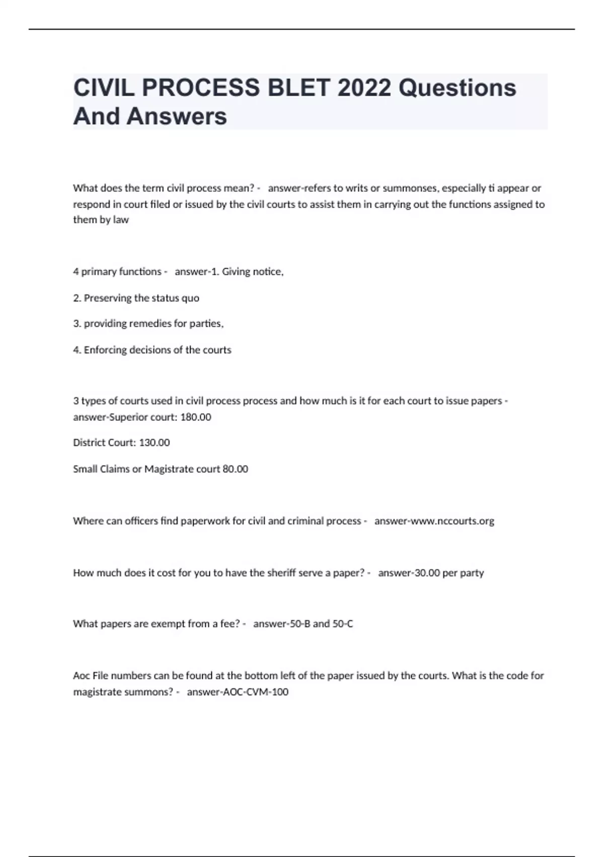 CIVIL PROCESS BLET 2022 Questions And Answers
