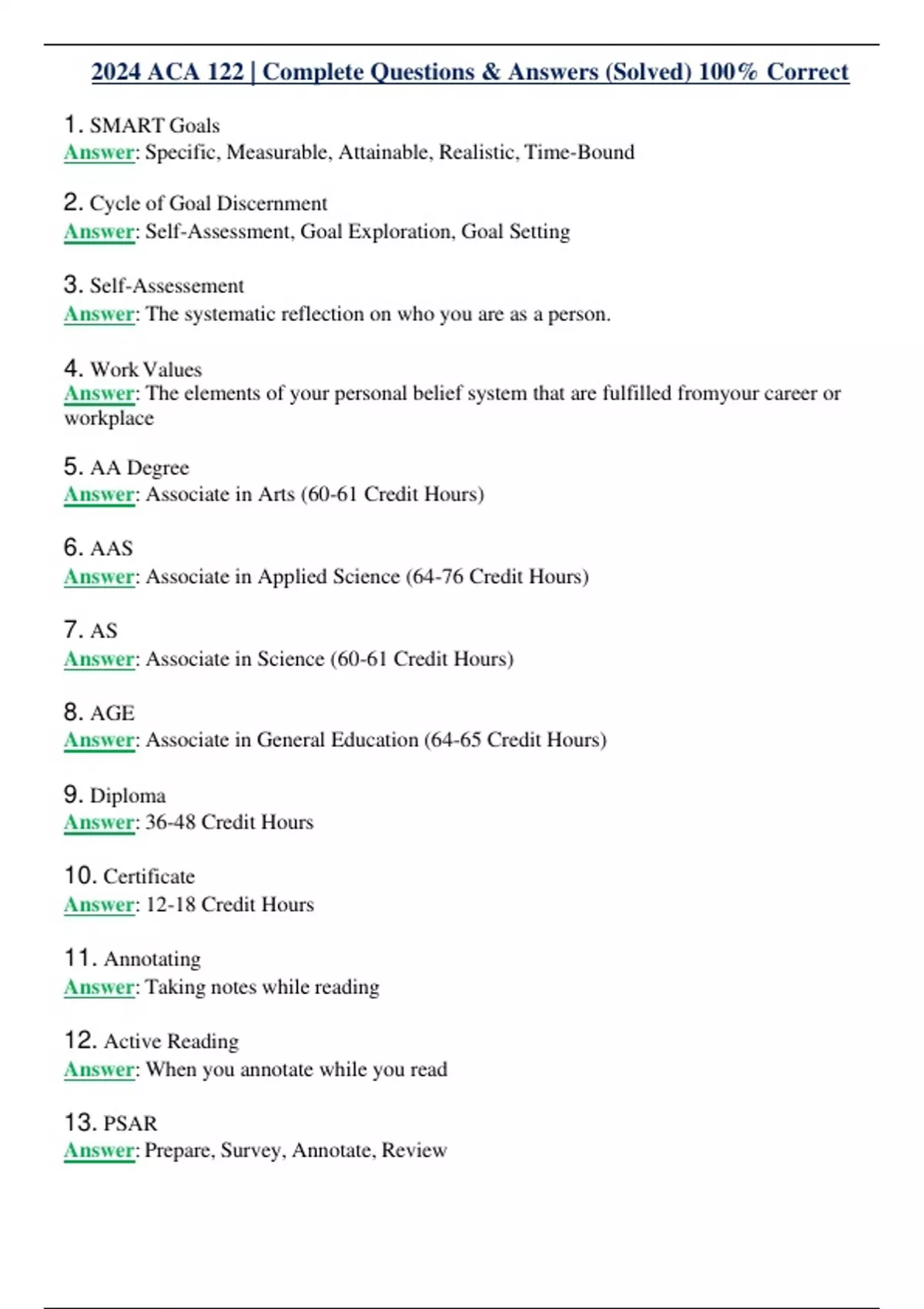 2024 ACA 122 | Complete Questions & Answers (Solved) 100% Correct 1. SMART Goals Answer: Specific, Measurable, Attainable, Realistic, Time-Bound 2. Cycle of Goal Discernment Answer: Self-Assessment, Goal Exploration, Goal Setting 3. Self-Assessement Answer: The systematic reflection on who you are as a person. 4. Work Values Answer: The elements of your personal belief system that are fulfilled fromyour career or workplace 5. AA Degree Answer: Associate in Arts (60-61 Credit Hours) 6. AAS Answer: Associate in Applied Science (64-76 Credit Hours) 7. AS Answer: Associate in Science (60-61 Credit Hours) 8. AGE Answer: Associate in General Education (64-65 Credit Hours) 9. Diploma Answer: 36-48 Credit Hours 10. Certificate Answer: 12-18 Credit Hours 11. Annotating Answer: Taking notes while reading 12. Active Reading Answer: When you annotate while you read 13. PSAR Answer: Prepare, Survey, Annotate, Review