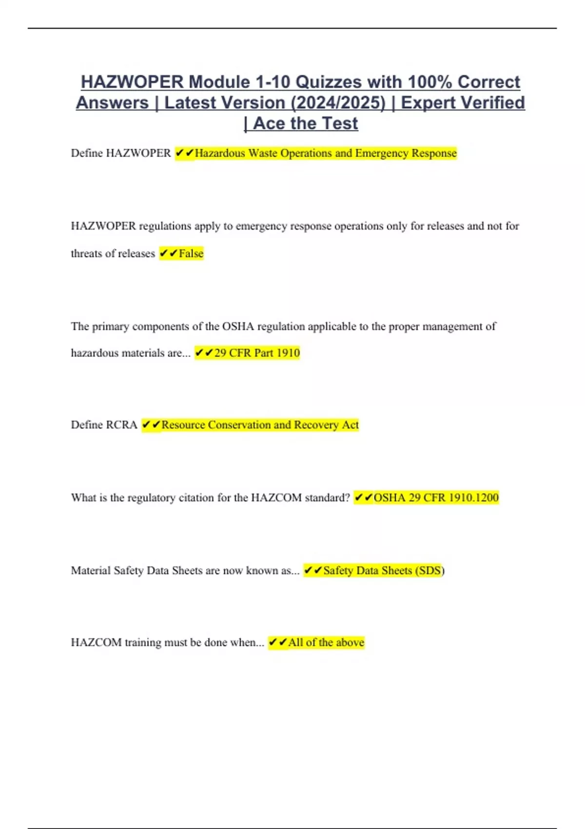 HAZWOPER Module 1-10 Quizzes with 100% Correct Answers | Latest Version (2024/2025) | Expert Verified | Ace the Test
