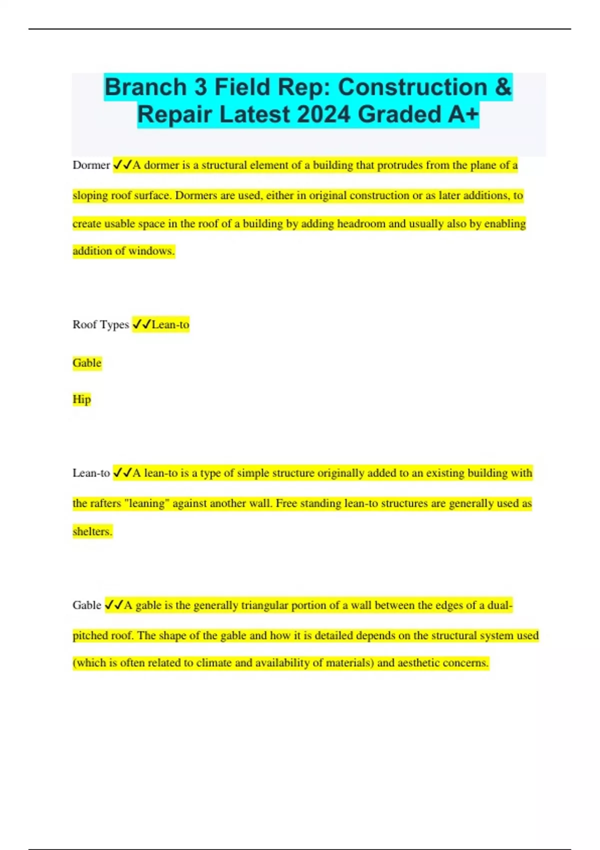 Branch 3 Field Rep: Construction & Repair Latest 2024 Graded A+ Dormer A dormer is a structural element of a building that protrudes from the plane of a sloping roof surface. Dormers are used, either in original construction or as later additions, to create usable space in the roof of a building by adding headroom and usually also by enabling addition of windows. Roof Types Lean-to Gable Hip Lean-to A lean-to is a type of simple structure originally added to an existing building with the rafters "leaning" against another wall. Free standing lean-to structures are generally used as shelters. Gable A gable is the generally triangular portion of a wall between the edges of a dual- pitched roof. The shape of the gable and how it is detailed depends on the structural system used (which is often related to climate and availability of materials) and aesthetic concerns. Hip a type of roof where all sides slope downwards to the walls, usually with a fairly gentle slope. Thus it is a house with no gables or other vertical sides to the roof. Boston Hip A style of shingling used in finishing the hip of a hip roof in which shingles are laid in two parallel rows Crawl Space Joists Subflooring Rim Joist Mudsill Girder Vent Pier Post Pier Pier Block Concrete Porch Slab Foundation Wall Form Board/ Debris Wood Debris Sewer Pipe Three Inspection Areas The Crawl Space Inside The Building The Attic Inside The Building Stud Sheathing Anchor Bolts Concrete Slab Footings Partition Wall Screeds Floor Sleeper Vapor Barrier Water Heater Closet Showers and bathrooms Water Test Attic Rafter Roof Joist Top Plate Shingles Sheathing Slab Problems (5) Cracks Grade Sakes Projecting Wood Members Imbedded Radiant Heat Pipes Imbedded