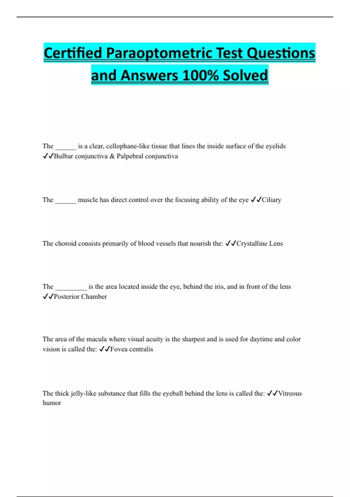 Certified Paraoptometric Test Questions and Answers 100% Solved The ______ is a clear, cellophane-like tissue that lines the inside surface of the eyelids Bulbar conjunctiva & Palpebral conjunctiva The ______ muscle has direct control over the focusing ability of the eye Ciliary The choroid consists primarily of blood vessels that nourish the: Crystalline Lens The _________ is the area located inside the eye, behind the iris, and in front of the lens Posterior Chamber The area of the macula where visual acuity is the sharpest and is used for daytime and color vision is called the: Fovea centralis