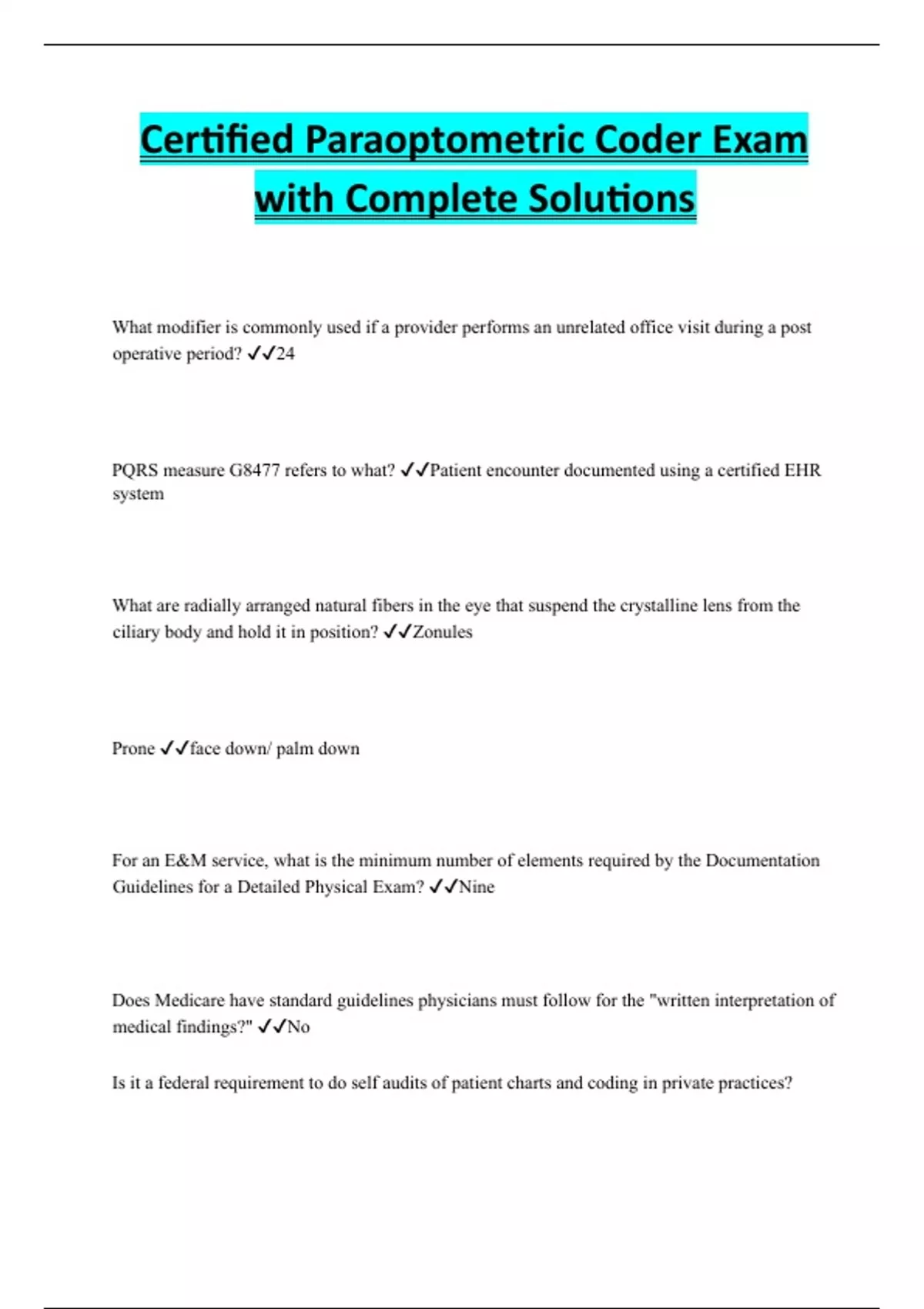 Certified Paraoptometric Coder Exam with Complete Solutions What modifier is commonly used if a provider performs an unrelated office visit during a post operative period? 24 PQRS measure G8477 refers to what? Patient encounter documented using a certified EHR system What are radially arranged natural fibers in the eye that suspend the crystalline lens from the ciliary body and hold it in position? Zonules Prone face down/ palm down For an E&M service, what is the minimum number of elements required by the Documentation Guidelines for a Detailed Physical Exam? Nine