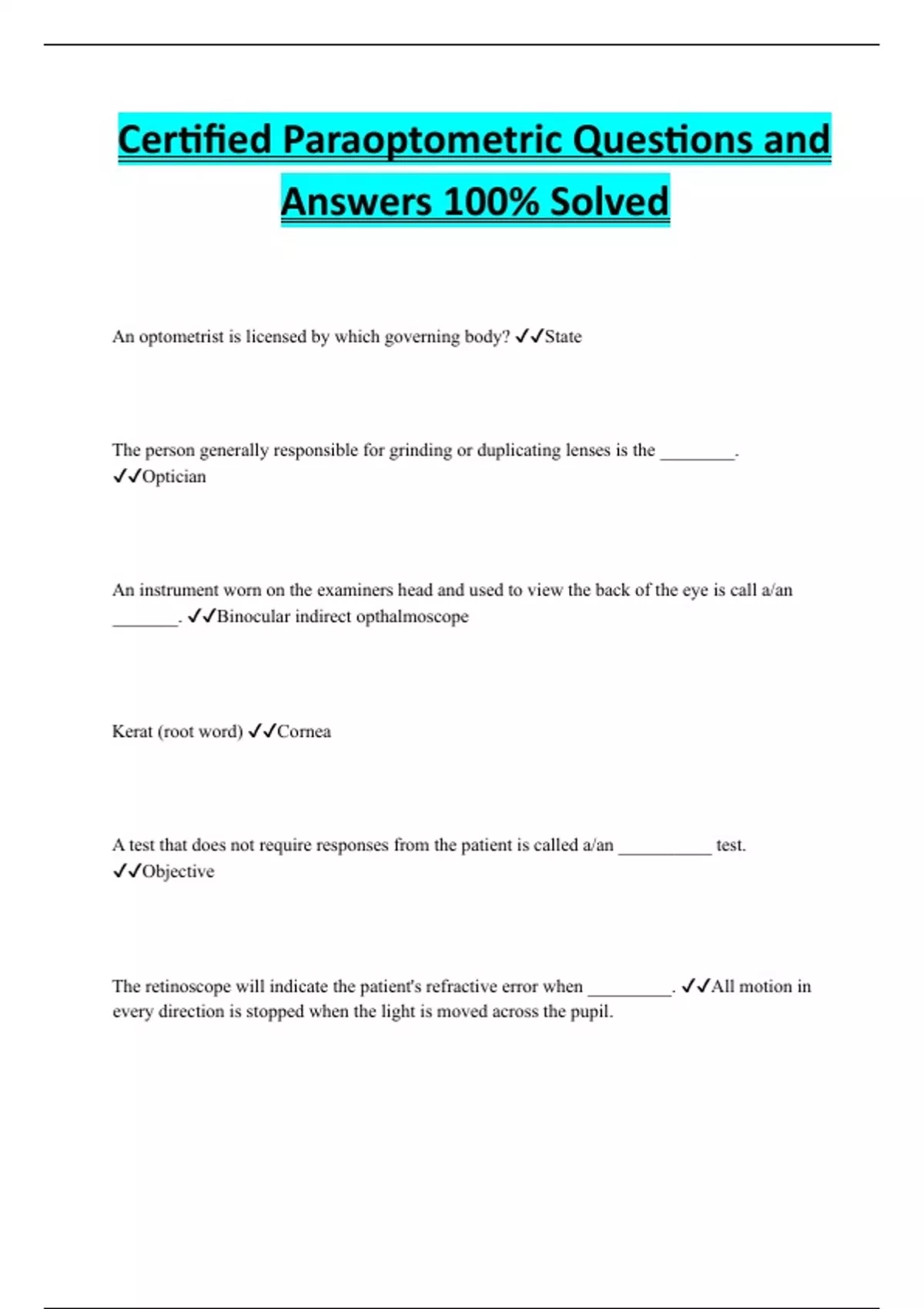 Certified Paraoptometric Questions and Answers 100% Solved An optometrist is licensed by which governing body? State The person generally responsible for grinding or duplicating lenses is the ________. Optician An instrument worn on the examiners head and used to view the back of the eye is call a/an _______. Binocular indirect opthalmoscope Kerat (root word) Cornea A test that does not require responses from the patient is called a/an __________ test. Objective The retinoscope will indicate the patient's refractive error when _________. All motion in every direction is stopped when the light is moved across the pupil.