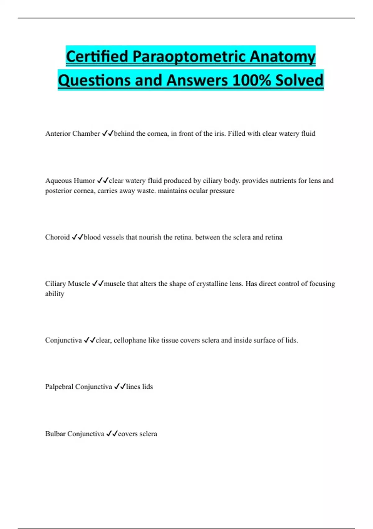 Certified Paraoptometric Anatomy Questions and Answers 100% Solved Anterior Chamber behind the cornea, in front of the iris. Filled with clear watery fluid Aqueous Humor clear watery fluid produced by ciliary body. provides nutrients for lens and posterior cornea, carries away waste. maintains ocular pressure Choroid blood vessels that nourish the retina. between the sclera and retina Ciliary Muscle muscle that alters the shape of crystalline lens. Has direct control of focusing ability Conjunctiva clear, cellophane like tissue covers sclera and inside surface of lids. Palpebral Conjunctiva lines lids