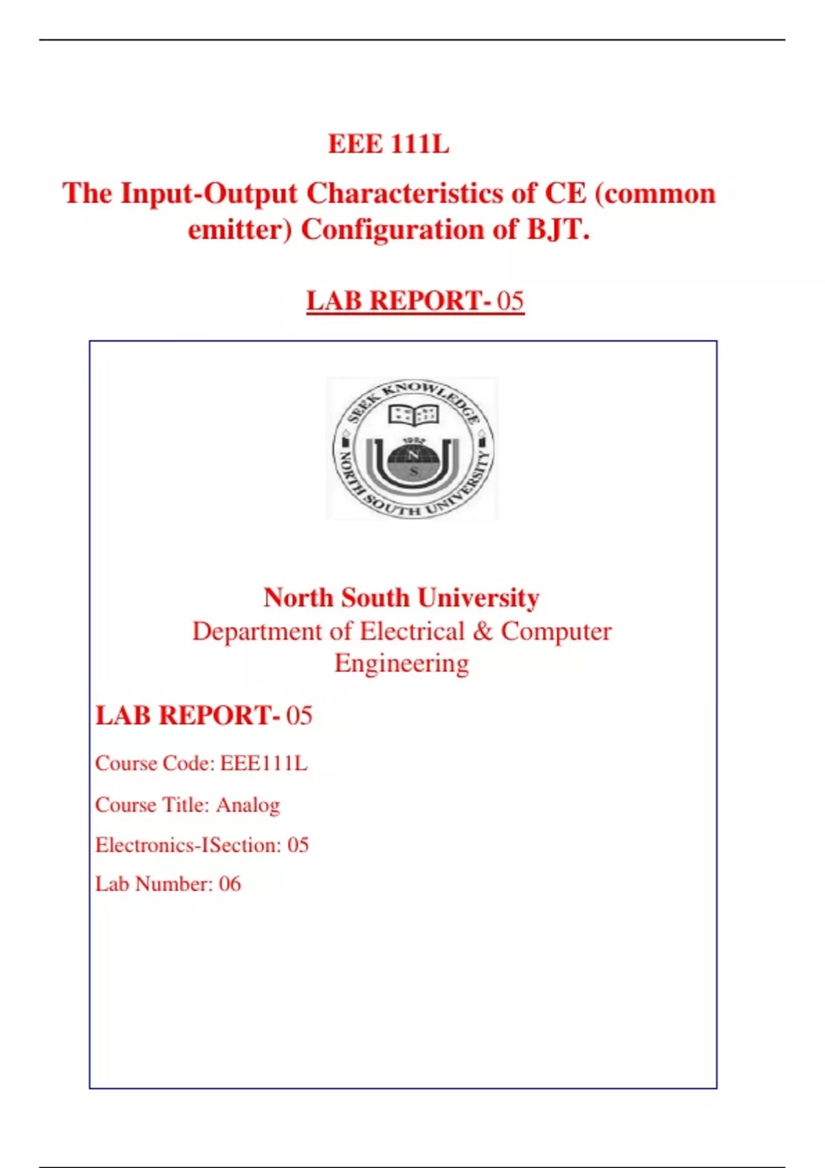 EEE 111L The Input-Output Characteristics of CE (common emitter) Configuration of BJT LABREPORT-05 North South University Department of Electrical & Computer Engineering Course Code: EEE111L Course Title: Analog Experiment name: The Input-Output characteristics of CE (common emitter) configuration of BJT. Objectives: ● Study of the input-output characteristics of CE (common emitter) configuration of BJT. Apparatus: ● Transistor (2N2222A) ●Resistor(100KΩ,1KΩ) ● Trainer Board ●DC powersupply ● Digital Multimeter ●Chordsandwire Theory: A transistor has three doped regions which are emitter, base, collector. In a transistor where the emitter is connected to both base and collector, we call it a common emitter transistor configuration. In common emitting transistors configuration input is taken from both emitter and base and the output is taken from the emitter and collector. There are three different currents in a transistor. They are emitter current, collector current and the base current. Emitter current is equal to summation of collector current and the base current. We can measure transistor characteristics from two characteristic curves which are input characteristics curve and output characteristics curve. Input Characteristics Curve: Output Characteristics Curve: